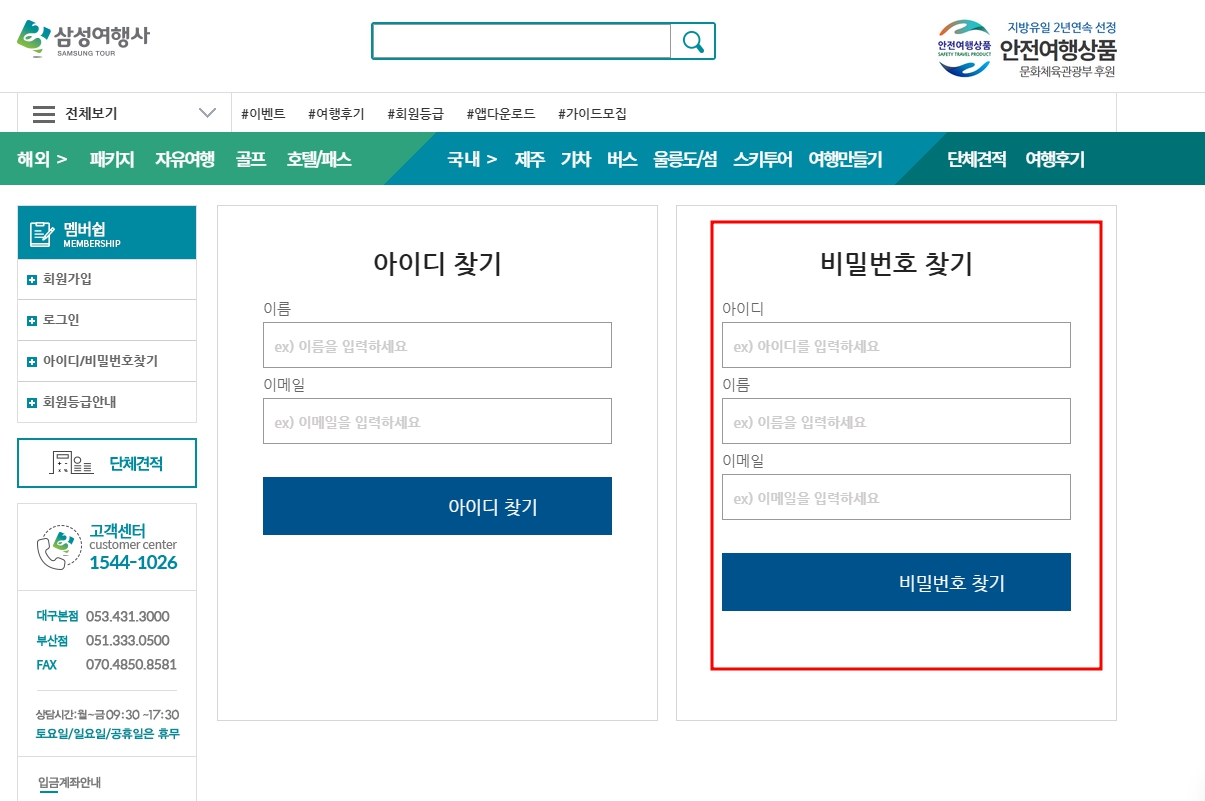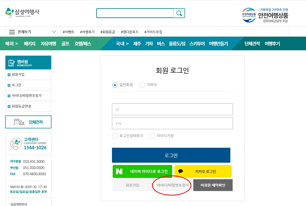 홈페이지 - 회원 로그인 화면에서 [아이디/비밀번호 찾기]를 누르고,