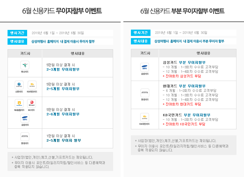 안녕하세요! 삼성여행사 입니다. 삼성여행사 홈페이지 내 예약 후 카드결제시 아래와 같이 무이지할부 이벤트를 진행하고 있으니 확인하시고 혜택 받으세요~ ◎ 접속방법 - PC / 모바일 / 어플 접속 > 예약 > 결제~! 1. PC : www.123tour.co.kr 2. 모바일 : m.123tour.co.kr 3. 어플 : 삼성/LG 안드로이드 어플 다운 클릭>>> https://goo.gl/icA14y 애플 아이폰 어플 다운 클릭>>> https://apple.co/2OSXp8v ![]() ◎ 유의사항