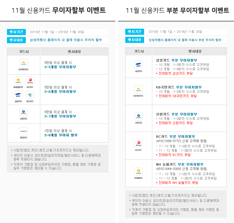 안녕하세요! 삼성여행사입니다. 삼성여행사 홈페이지 내 예약 후 카드결제시 아래와 같이 무이지할부 이벤트를 진행하고 있으니 확인하시고 혜택 받으세요~ ◎ 접속방법 - PC / 모바일 / 어플 접속 > 예약 > 결제~! 1. PC : www.123tour.co.kr 2. 모바일 : m.123tour.co.kr 3. 어플 : 삼성/LG 안드로이드 어플 다운 클릭>>> https://goo.gl/icA14y 애플 아이폰 어플 다운 클릭>>> https://apple.co/2OSXp8v ![]() ◎ 유의사항 - 사업장(법인, 개인), 체크, 선불, 기프트카드는 제외 됩니다. - 무이자 이용시 다른 혜택(각 카드사 혜택)과는 중복 적용되지 않습니다. - 본 이벤트는 11월 한정이며 어플리케이션 접속시 애플 아이폰 카드결제는 현재 준비중으로 PC 접속 후 결제 부탁드립니다~ 감사합니다. |