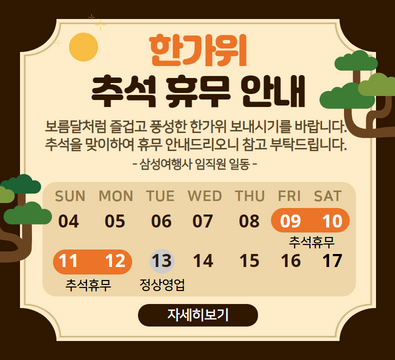 추석 연휴 휴무일 : 22. 09. 09(금) ~ 22. 09. 12(월)