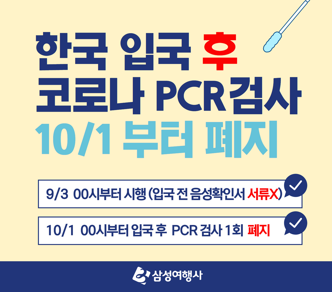 한국 입국 후 24시간 이내 필수로 해야했던 PCR검사가 10/01 00시부터 폐지되었습니다. 앞으로는 한국 출입국시 코로나 관련 검사 및 백신 서류가 일체 필요가 없어 좀 더 편하게 해외여행 준비를 하실 수 있으니 참고 부탁드립니다. ^^