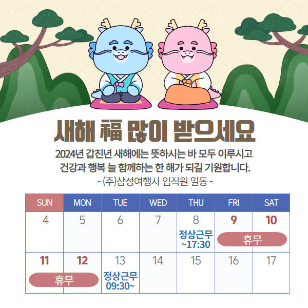 설날 휴무일 : 24. 02. 09(금) ~ 24. 02. 12(월) 24:00 정상 근무일 : 24. 02. 13(화) 09:30부터 정상영업