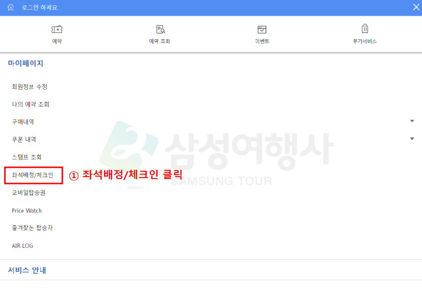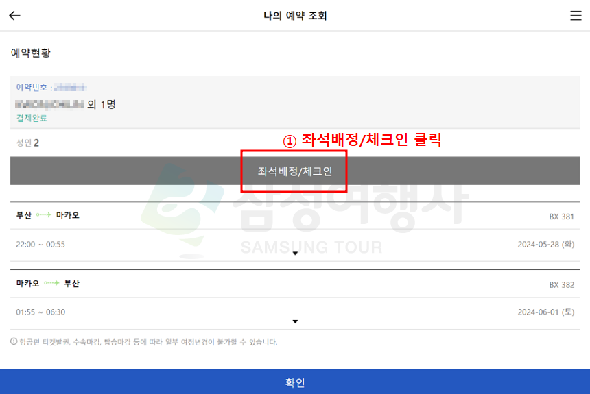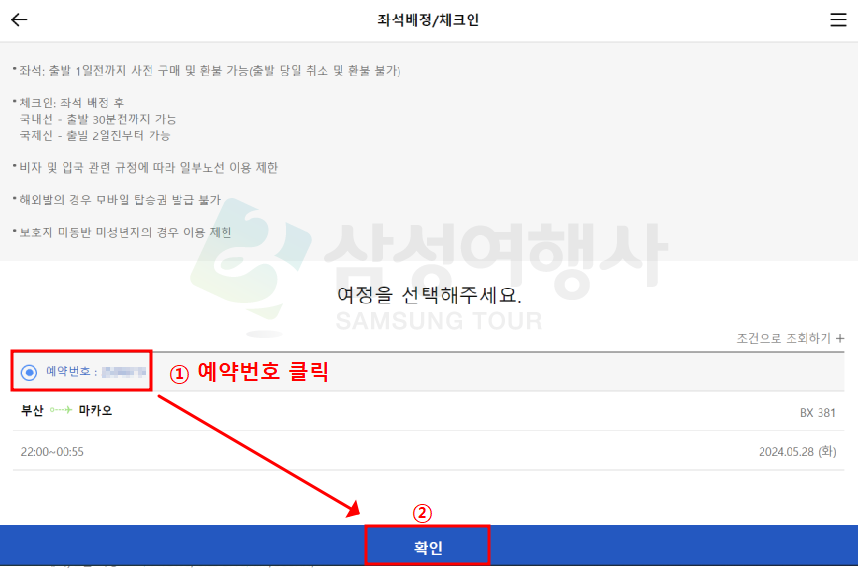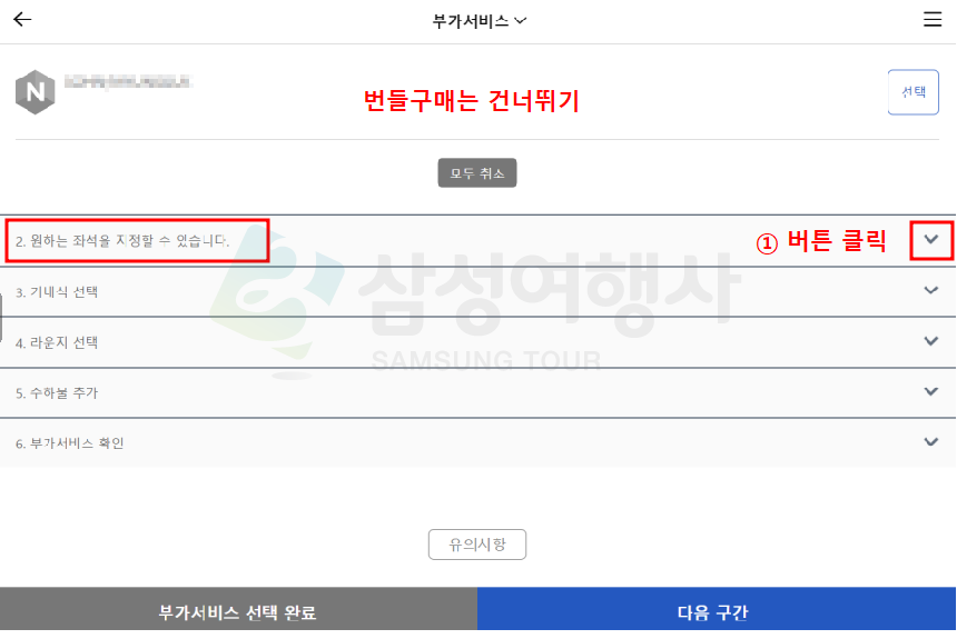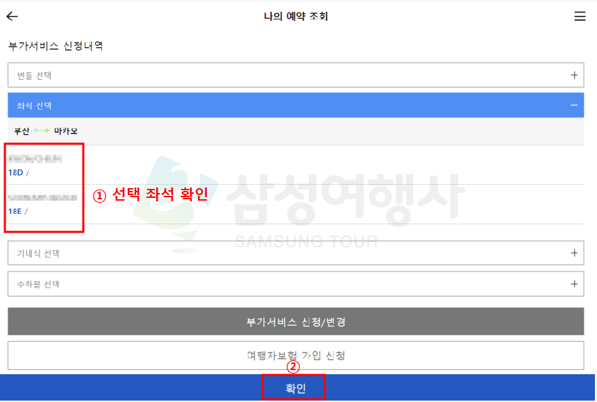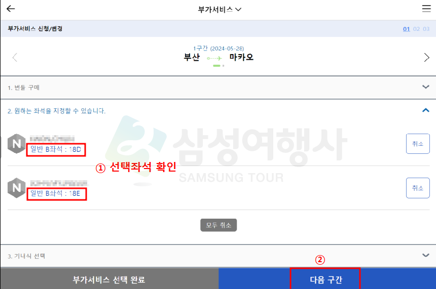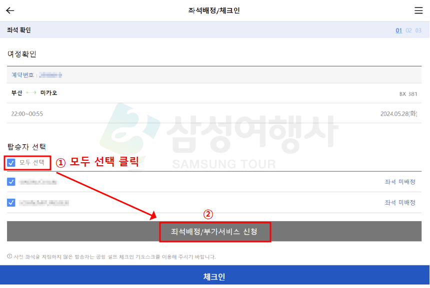 6. ①탑승자 모두 선택 > ②좌석배정/부가서비스 신청 클릭!