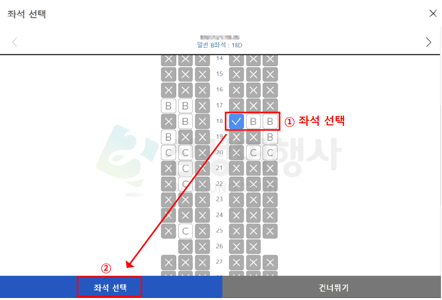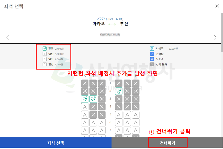 12. 리턴편 좌석 지정시 추가금 발생 예시 화면 > ①건너뛰기 클릭