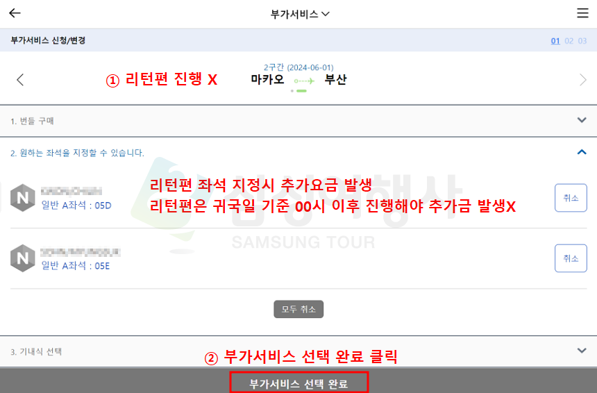 11. ①리턴편 진행X (리턴편 진행시 추가요금 발생) > ②부가서비스 선택 완료 클릭