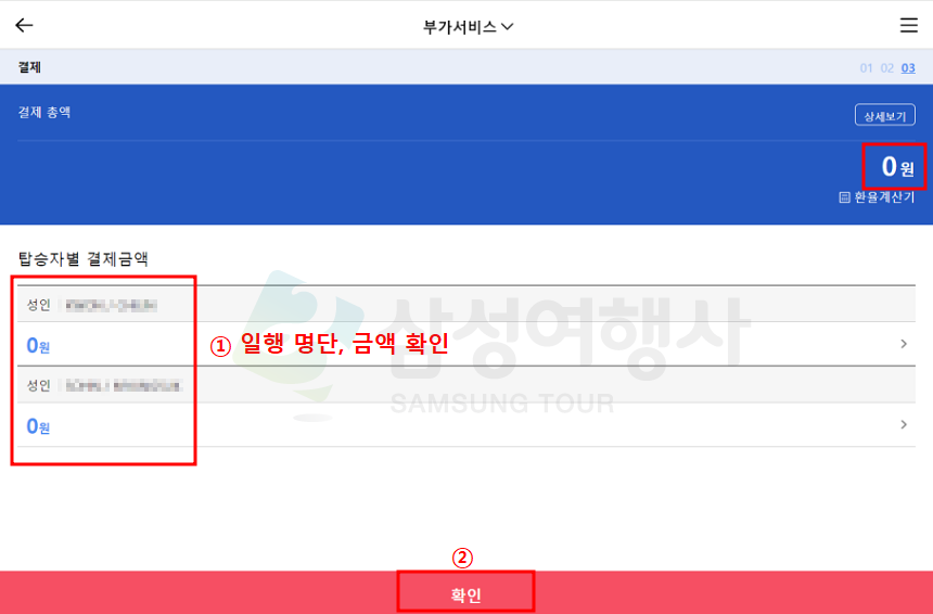 13. 부가서비스 선택 완료 후 ①일행 명단, 금액 확인 > ②확인클릭