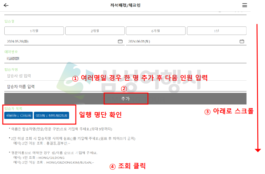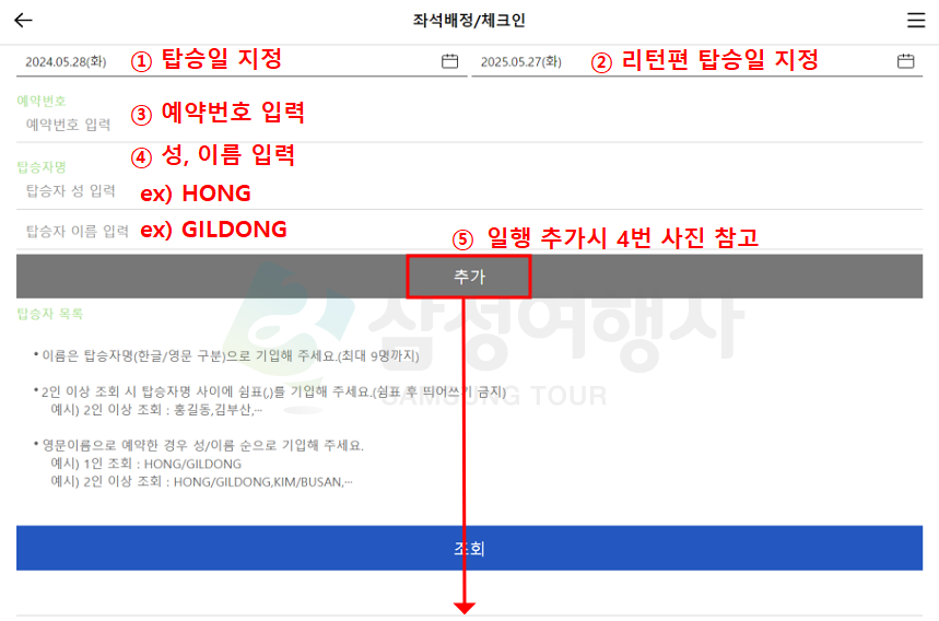 4. 탑승자 모두 입력 > 탑승자 명단 확인 후 아래 ④조회 클릭!