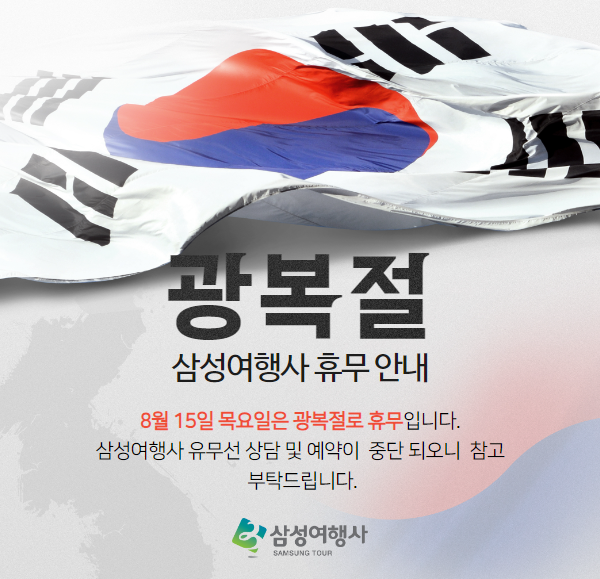 광복절 휴무일 : 24. 08. 15(목) 전일 정상 근무일 : 24. 08. 16(금) 09:30부터 정상영업
