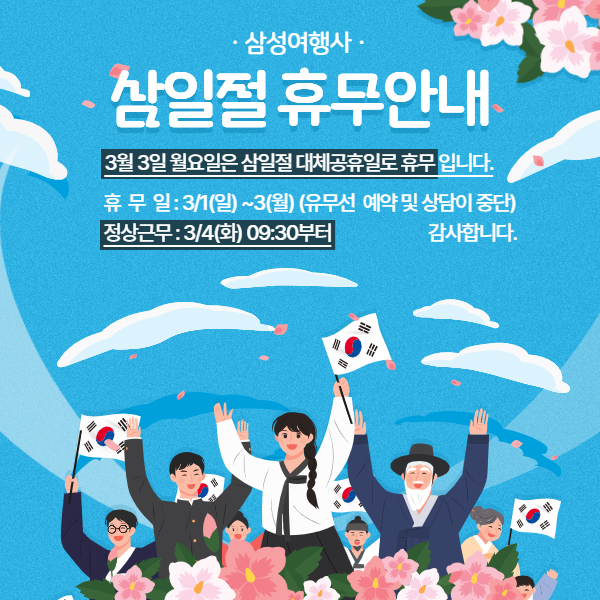 삼일절 휴무일 : 25. 03. 01(토) ~ 25. 03. 03(월) 정상 근무일 : 25. 03. 04(화) 09:30부터 정상영업