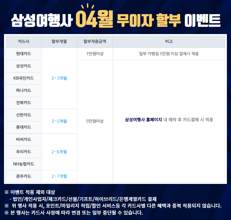 홈페이지에서 예약 후 결제 시 25년 4월 카드 무이자 할부 관련 안내 드리니 아래와 같이 확인부탁드립니다.