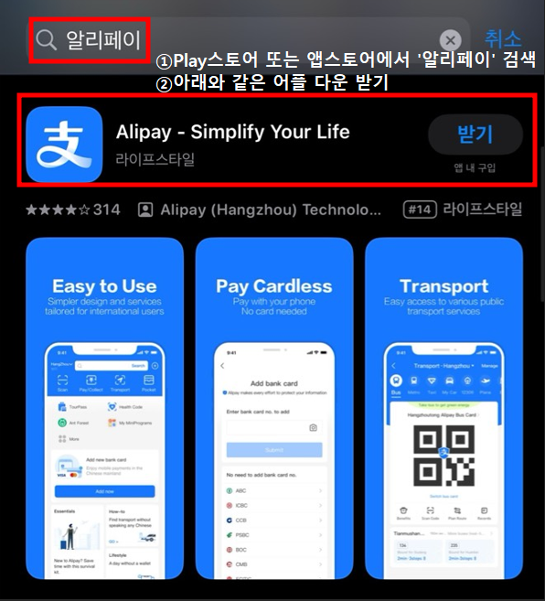 1. Play스토어 또는 앱스토어에서 '알리페이' 검색 후 다운로드