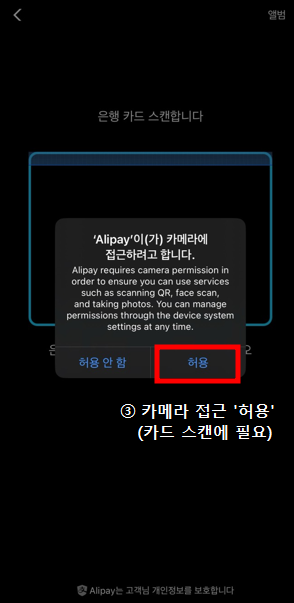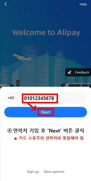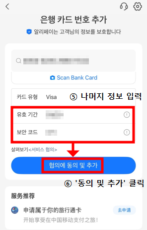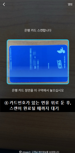 알리페이(Alipay) 가입 및 카드 등록 시 아래와 같이 진행하시면 됩니다.