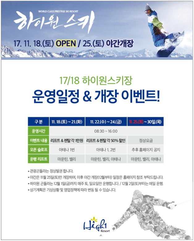 안녕하세요 삼성여행사 스키팀입니다~!! 17/18 하이원 슬로프 및 운영시간안내입니다.(아래 사진참조) **비수기 스키버스 상품은 25일부터 오픈되어있습니다.** ![]() ※예약 마감시간 안내※ 1. 비수기기간(11/25~12/8) -11/25,26,27 마감시간은 24일 금요일 낮12:00마감 입니다. -12월2일(1일 15:00마감) // 12월3,4일(2일 낮12:00마감) 입니다. -화~토 : 출발1일전 15:00마감입니다. 2. 성수기기간 예약 변경&마감시간(출발일기준) -화~토 : 출발 1일전 15:00까지 마감. -공휴일,일요일,월요일 : 출발 1일전 12:00까지 마감. *스키상품은 공휴일도 주말적용 됩니다. *예약마감 시간은 꼭 지켜주시기 바라며, 예약취소 및 변경도 마감시간을 적용합니다. 3. 비수기기간(11.25~12.8//18.2.19~폐장일)은 최소출발인원 10명이하시 취소 됩니다. 17/18 시즌 많은이용 부탁드리며, 즐거운 여행 되시길 바랍니다~!! |