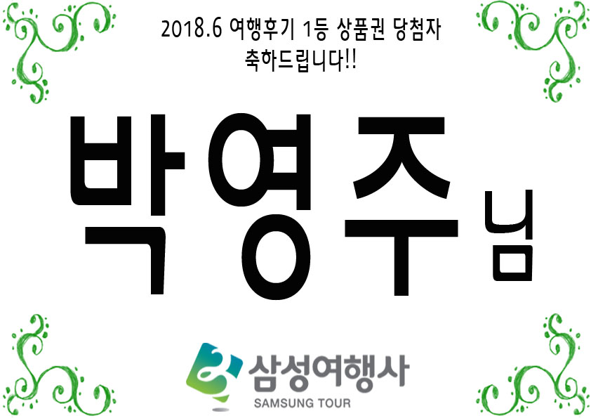 1년의 절반을 마무리하는 6월이였습니다. 청량한 바람은 날이 점점 더워가는 가운데 잠시 쉬어가라고 이야기를 하는 것 같습니다. 그동안 여러분께서는 계획했던 많은 일을 진행하셨나요? 다시 한 번 올 초에 계획했던 일들을 다시 한번씩 생각해보며 6월 후기 이벤트를 발표하며 당첨자는 아래와 같습니다. ★1등 백화점 상품권(3만원) 당첨자: 박영주님 010-3253-**** ★1등 후기 : www.123tour.co.kr/WBBS_2012/View.asp ★영화권 당첨자 : 총 11명 ![]() 당첨되신 모든 분들께 진심으로 축하드립니다. 7월에도 여행후기 많은 참여 부탁드리며, 상품권은 개별연락드리며, 영화표는 여행후기 등록 당시 연락처로 보내드립니다. 감사합니다.! |