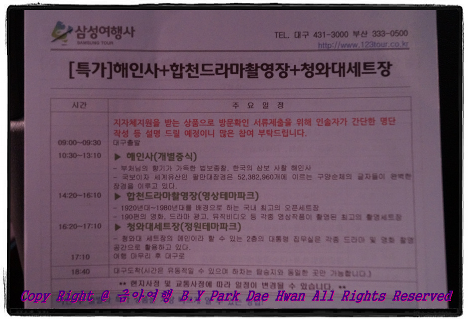 하루동안 해인사 + 합천영상테마파크 + 합천 청와대세트장 코스 정말 구경을 잘 하였습니다. 대구출발기준 왕복 버스이용료와 입장료 포함하여 19,900원이면 정말 저렴한 가격입니다! 지자체 지원이라고 하지만 그래도 이 가격에 알차게 여행할 수 있다는 자체가 너무나도 좋았습니다. 이 날 안전운행해주신 드림관광 7984호 기사님과 가이드님이셨던 여승인 가이드님 두 분 모두 대단히 고생많으셨습니다..^^