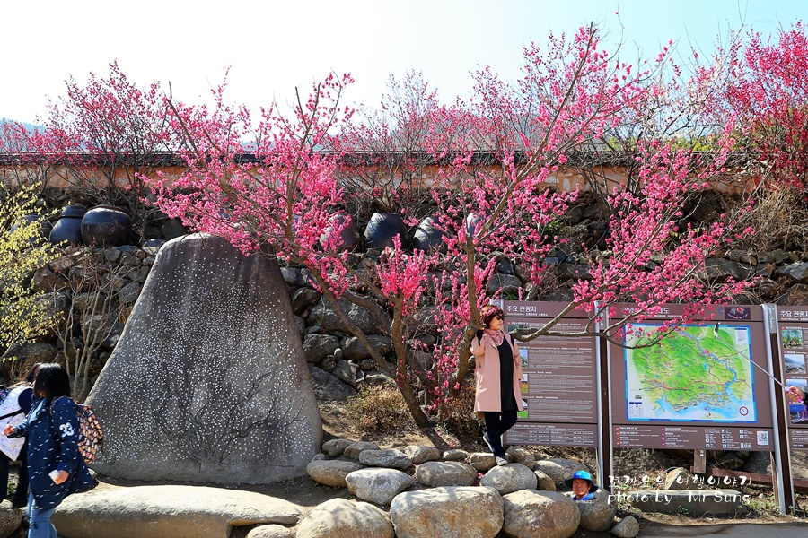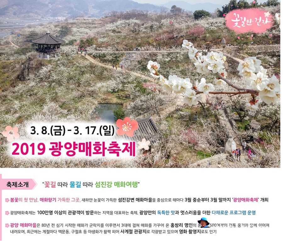봄이 오는 길목에서 3월 8일부터 광양 매화축제가 열리기도 한다. 광양 매화마을은 섬진강을 굽어보며 화사한 매화꽃이 뽀얀 안개처럼 마을을 덮어 장관을 이룬다. 또한 겨우내 숨죽여 있던 매화들이 봇물 터지듯 피어나 화려한 꽃 잔치를 펼쳐지기도 하지만 이곳의 매화는 특히 섬진강의 은빛 모래, 푸른 하늘과 어우러져 황홀한 봄 풍경을 선사하면서 마치 한 폭의 그림 같은 풍경을 연출하면서 보는 이로 하여금 감탄사를 저절로 토해내기도 할 것이다. 매화마을은 굳이 매화가 아니더라도 이곳은 언제 가도 볼거리가 넉넉하다. 특히 2000여 개에 달하는 항아리들이 마당을 가득 메우고 있는 청매실농원의 모습이 이채롭다. 푸른 기운이 청아한 청 매화, 발그스름한 빛깔이 따사로운 홍매화, 그리고 눈처럼 하얀 백매화등 빛깔도 다양한 매화 산책로는 걷는 것만으로도 행복감을 안겨줄 것이다.