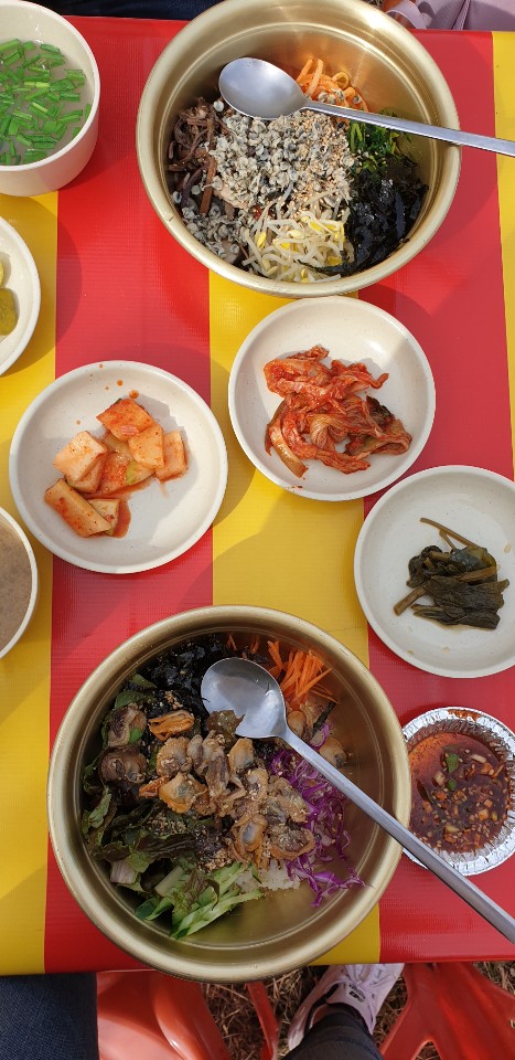아, 그리고 매화마을축제장 내에서 먹거리도 많이 판매하고 있던데 저희도 그 곳에서 점심으로 재첩비빔밥과 꼬막비빔밥을 먹었습니다. 저희가 갔던날은 다행히 미세먼지가 없는 날이라서 야외에서 소풍나온 기분으로 밥도 먹고 좋았습니다.