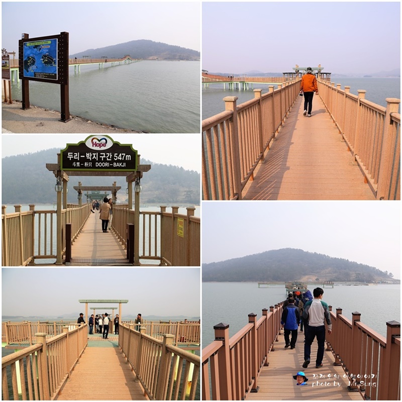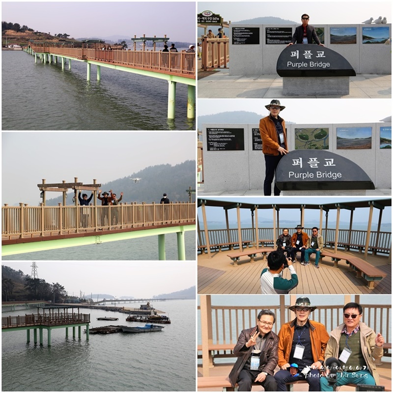 아래 사진은 퍼플교 신안 안좌도와 박지도, 반월도를 각각 연결하는 나무다리 '퍼플교'특히 안좌도에는 박지도·반월도를 잇는 목교인 '퍼플교'가 인기다. 걸어서 박지도에서 목포까지 가는 것이 소망이었던 주민 김매금 할머니의 꿈을 이루기 위해 나무 다리를 만들었으며, 보라색 꽃과 농작물이 풍성해 퍼플교라 불린다.