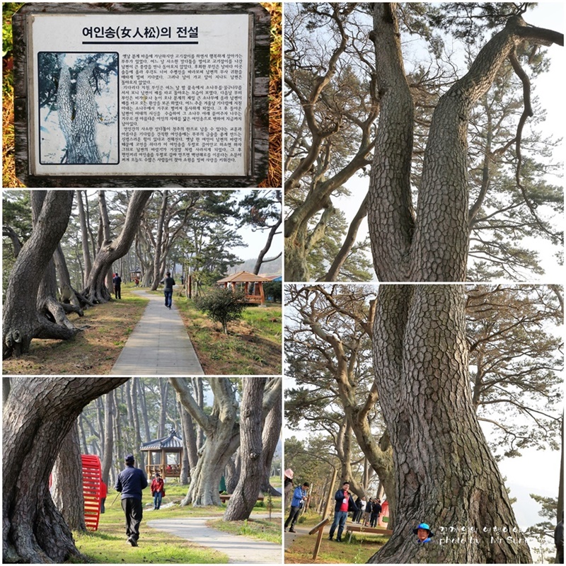 아래의 사진은 여인송 숲 여인송 숲(자은면)조선시대부터 방풍림으로 조성한 숲으로 인근에 매의 형상을 닮은 응암산, 소의 뿔을 닮은 우각도와 함께 아름드리해송 100여 그루가 장관을 이룬다.이 여인송은 연인들의 아름다운 사랑을 이어준다는 전설을 간직하고 있어 많은 관광객들이 찾는 명소이다.자은면은 여인의 몸매를 꼭 닮은 형상을 한 아름드리 소나무인 '여인송' 숲과 200년 이상된 수많은 노송들이 바다를 감싸듯이 자리 잡고 있는 백사장이 여유로웠다.