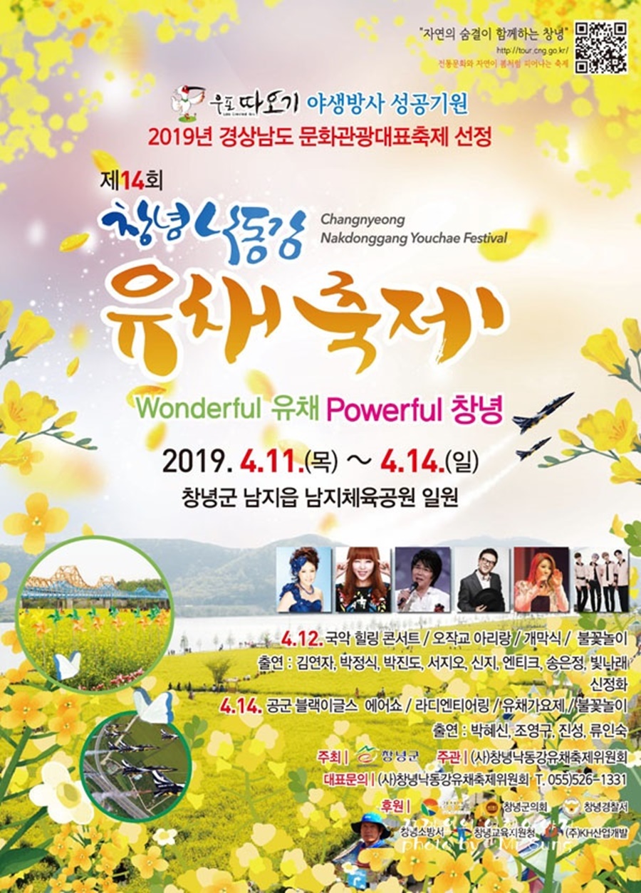 제14회 창녕낙동강유채축제가 11일인 오늘부터 14일까지 경남 창녕군 남지읍 낙동강 둔치 유채단지 일원에서 열린다. ‘자연과 사람의 만남’이라는 주제로 열리는 이번 축제는 단일면적 전국 최대 규모로 110만㎡(약 33만 평)의 유채 꽃 단지에서 4월 한 달간 노란 유채 물결과 함께 낙동강의 푸른 물결이 한 폭의 풍경화 같은 모습으로 상춘객의 발길을 유혹한다. 올 해는 작년보다도 날씨가 포근해서 그런지 유채꽃이 일찍 피어나 축제기간인 지금은 유채꽃이 100% 만개를 하여 아름다운 풍경을 자랑하기도 한다. 또한 유채 꽃길을 걸어보면서 유채꽃 향기에 흠뻑 취해보기도 하고 아름다운 풍경을 배경으로 사진을 담아보면서 힐링을 하기에도 좋은 곳이다. 그래서 다가오는 주말에 나들이를 가보면 후회 하지를 않을 것이다.
