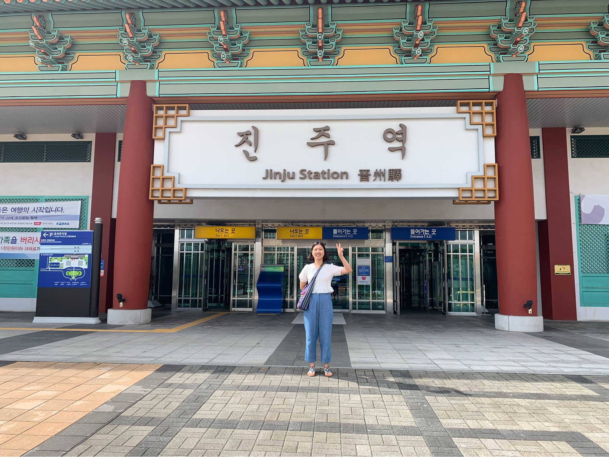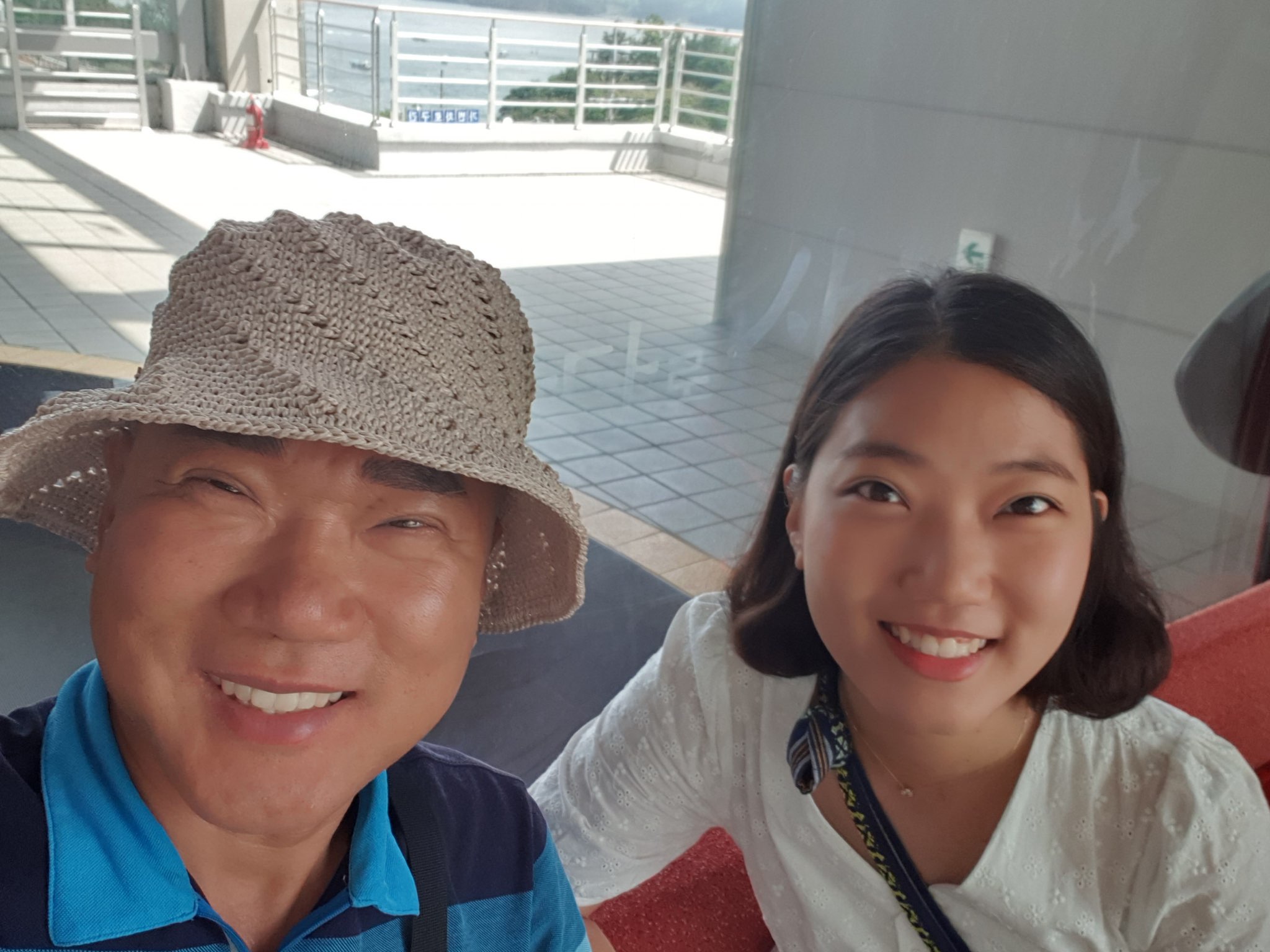 진주역에 도착하니 약간 한옥 느낌으로 되게 멋있게 되있더라구요~ 그래서 아빠랑 인증샷을 찍고, 우릴 기다리는 노랑색 버스에 탑승했습니다. 현지 기사님이 싱글벙글 반겨주셨고 사천바다케이블카로 이동했습니다!