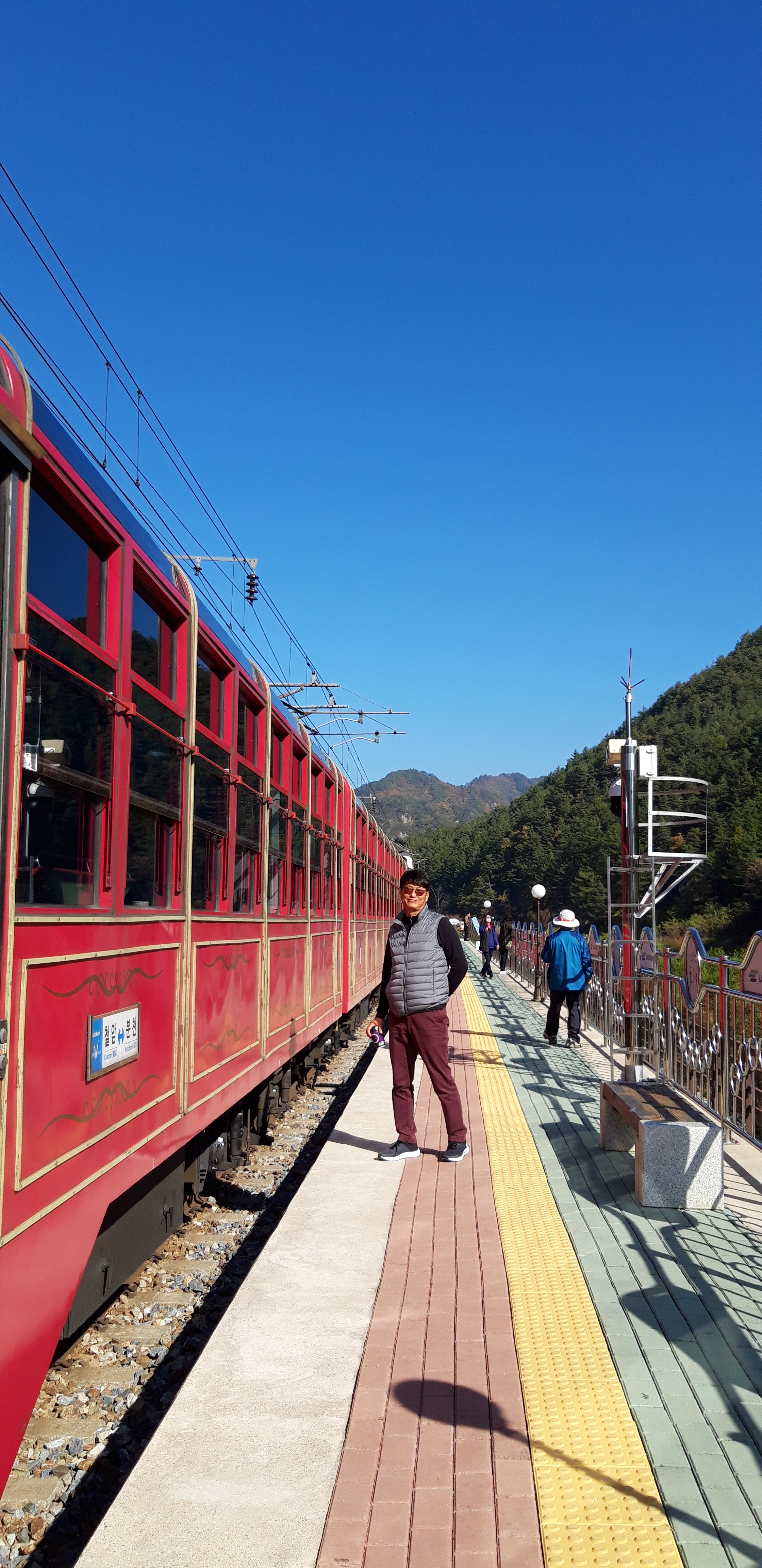 10/27일 화창한 가을날, 남편과함께 삼성여행사 1일 투어를 떠났다 봄에 다녀온 남해여행이 무척 마음에 들었던 남편은, 이번 여행에도 함께 동행했다. 무궁화호를 역에서 타고 첫코스인 분천역에서 내렸다, 분천역 산타마을은 동심가득한 곳이였다 애들이 다 커서 크리스마스츄리도 안만드는데, 산타클로스를 보니 빨리 크리스마스가 다가오기를 바라는 마음이 들었다. 분천역에서 빨간 협곡열차를 탔다. 기차가 예뻐서 기분좋고, 터널속에는 기차천장에 야광스티커들이 에뻤어요. 전국에서 제일 작은 양원역도 보고 승부역에 내려서 경치도 보고, 철길에서 사진도 찍고, 파란하늘과 울긋불굿단풍은 아름다웠다 철암역에 도착,아주 좋은 리무진버스를 타고, 하이원추추파크에 도착, 점심을 먹은후 레일바이크를 탔다. 생각보다 길이가 길었고, 바람에 추위를 느꼈지만 높은산속에서 내려오며 경치를 감상할수 있어 좋았다. 버스를 타고 '태양의 후예' 촬영지에 들러 메디큐브와 헬기, 탱크 등을 관람한 후 한강발원지 검룡소를 산책코스로 다녀오고 마지막코스인 황지연못에 들렀다. 해설사를 만나 낙동강 발원지에 대한 자세한 설명을 듣고 바로 옆 길건너에 있는 태백시장에서, 맛나고 양많은 옹심이 감자칼국수를 배부르게 먹고 무궁화를 타고 무사히 잘 귀가했다. 편한여행이 되도록 가이드 잘해주신 이소영 가이드님 감사해요. 겨울 여행도 삼성여행사를 이용할게요, 주위지인들에게도 삼성여행사를 알리고 있답니다.~~