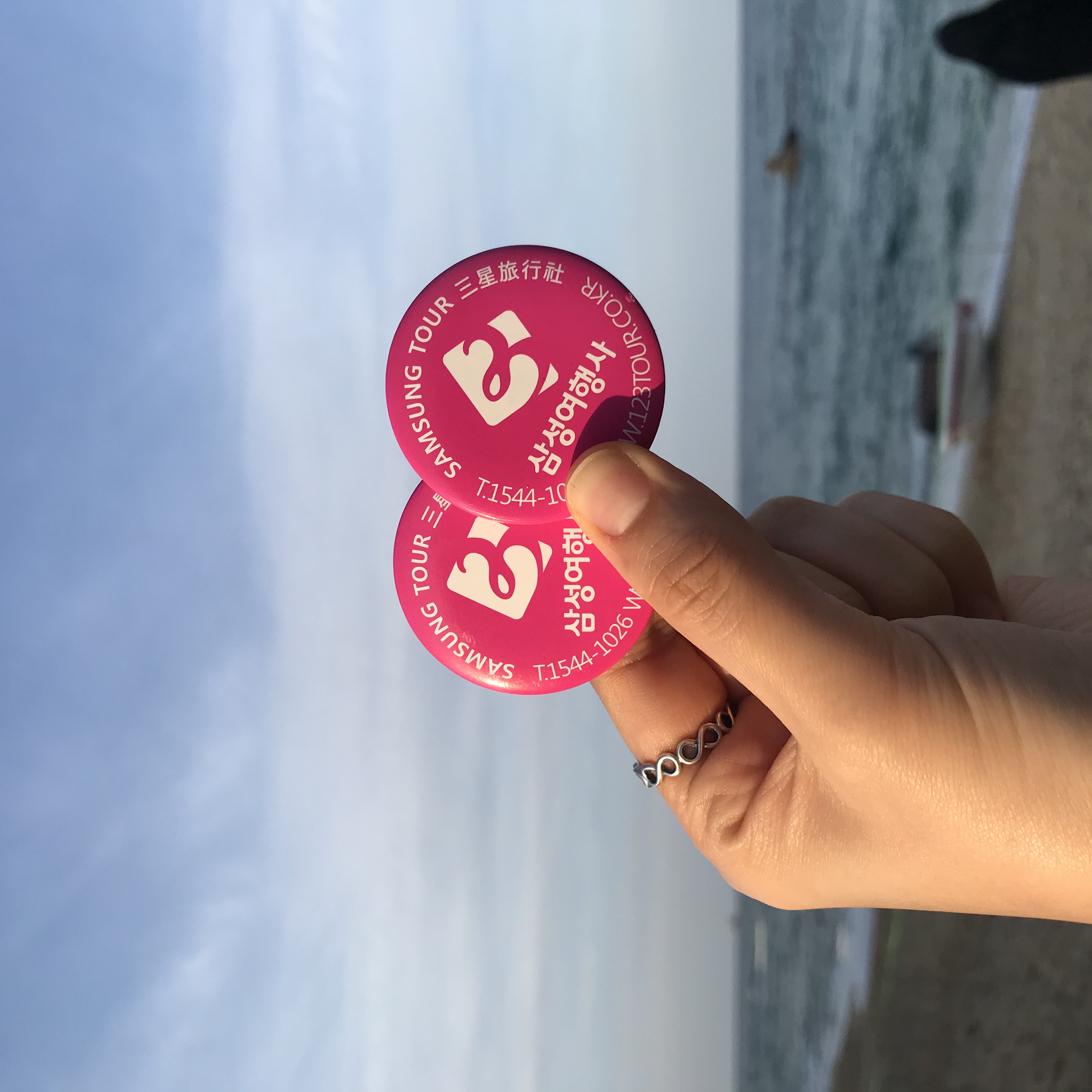 양떼목장 입장권을 대신하던 여행사 뱃지입니다! 안목해변가를 배경으로 찍어 보았어요!