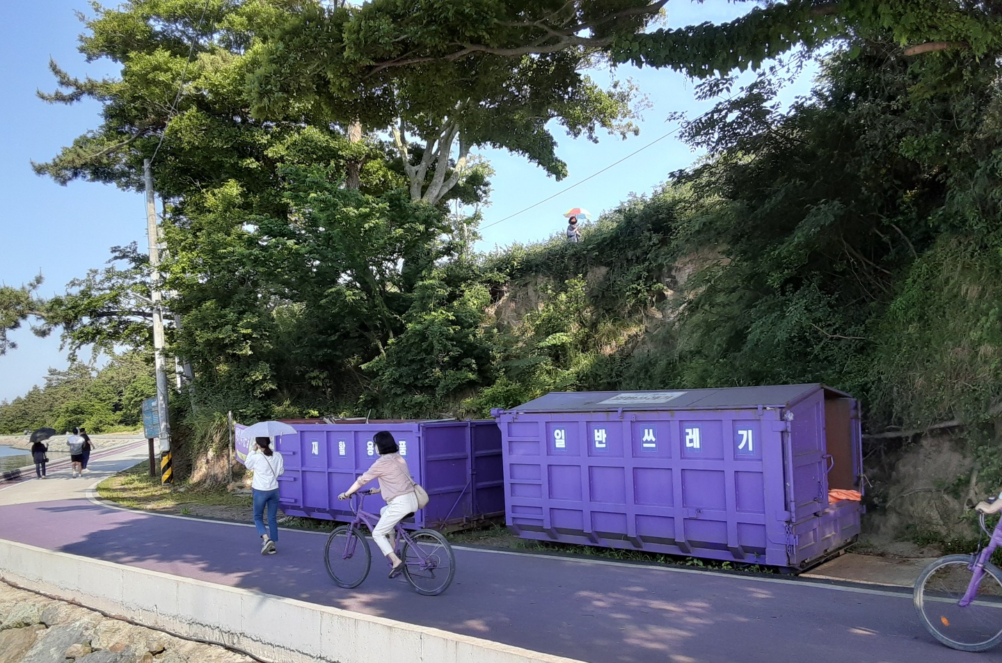 컨테이너 쓰레기통도 보라색이라 신기해서 한컷 했습니다.  자전거도 보라색이네요