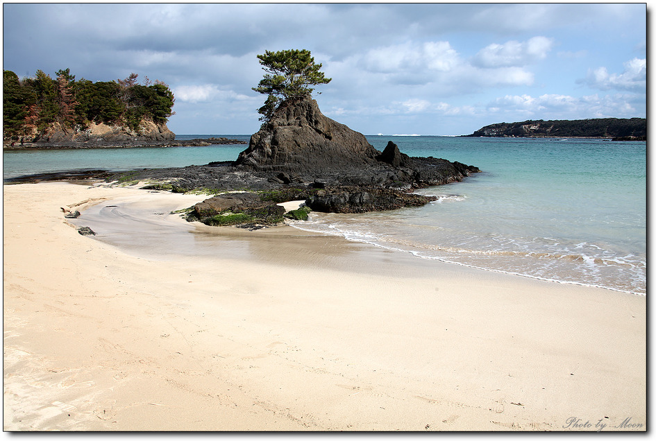 미우다 해수욕장 입니다, 모래가 아주 보들보들, 가운데 보이는 바위섬이 있는데 한바퀴 돌면 이상한 전설이 있습니다.