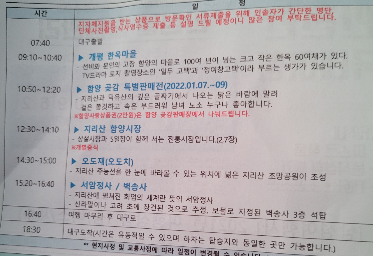 마냥 신나고 기다려지던 여행이 단지 새벽잠을 깨야 한다는 오직 그 이유하나로 슬슬 꾀가 나기 시작하면서 다녀온 이번 여행은 많은 것을 배운 일정이었다. 옛날 만석지기 재산은 요즘 시세로 8천억쯤 된다는 소소한 것 부터 대갓댁 고샅길의 바닥에 돌을 깔아둔 3가지 이유라던지 전체 일정에 안내자분들이 빠짐없이 있어 그때 그때 궁금한 것을 질문해 볼수도 있었고 해설사분이 각각 달라서 그분들의 해설을 듣는 재미 또한 솔솔했다. 취소된 곶감축제 대신 추가된 개평한옥마을도 좋았고 상림, 곶감판매장, 지리산함양시장, 오도재 고갯길, 서암정사, 등 모든 일정이 참 잘 짜여졌다. 벽송사를 가지 못해서 아쉬움이 많아 남았지만, 같은 일정으로 삼성여행사에서 별도 여행상품을 꾸린다면 이번에는 꼭 벽송사를 가야지 싶었다. 회원 한 분 한 분, 일정 매순간 허술함없이 챙기느라 수고 많으셨던 여승인가이드님 다음에 또 뵈요.