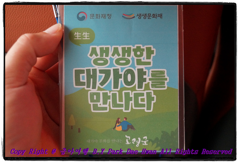 일정표와 삼성여행사 뺏지 입니다. 이 날 일정으로는 "생생한 대가야를 만나다 - 고령 생생문화제 체험" 부터 대가야시장 중식, 우륵박물관, 개실마을까지 둘러보는 코스였습니다. 대구와 가까운 곳에 여행금액이 38,000원이었지만 각종 입장료와 스냅사진 1장 받고 딸기주스 1잔에 고령사랑상품권 1만원권 제공이면 상당히 가성비 있는 여행입니다. 뺏지는 제 개인적인 생각이지만 입장료 받는 관광지에선 저 뺏지만 보여주면 바로 입장이 가능하기에 하이패스 기능도 되고 가이드님께서 저 뺏지를 보고 삼성여행사 고객님이시구나 하고 알아볼 수도 있고 사진도 찍어주시는 GPS 기능까지 2가지 기능이 있는 뺏지라고 생각합니다 ㅎㅎ