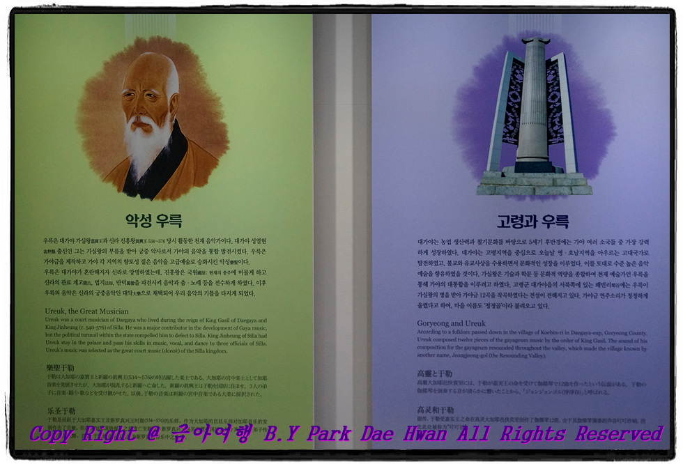 대가야시장 식사를 마친 후 다음 목적지로 "우륵박물관" 으로 이동하였습니다. 우륵박물관은 가야금을 창제한 악성 우륵과 관련된 자료를 수집하여 우륵과 가야금의 세계를 쉽게 이해할 수 있는 "우륵과 가야금" 전문박물관 입니다. 우륵은 대가야 가실왕 때에 활동한 우리나라 3대 악성의 한 사람 입니다. 가실왕의 부름을 받아 대가야의 음악과 춤, 노래 등을 통합 발전시키고 당시 전해지고 있던 여러 형태의 현악기를 토대로 가야금을 창제하여 가야금 12곡을 작곡한 사람이기도 합니다.