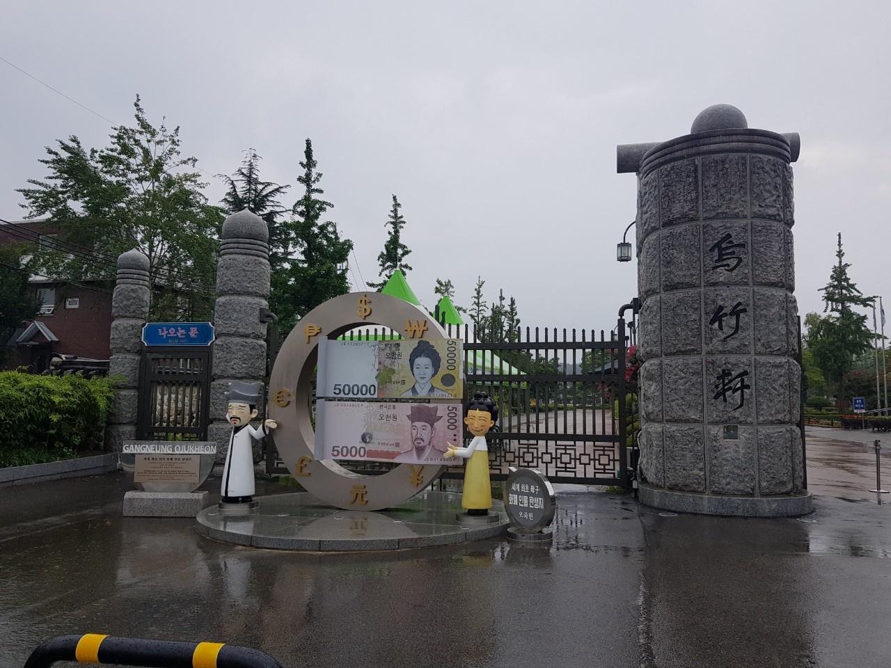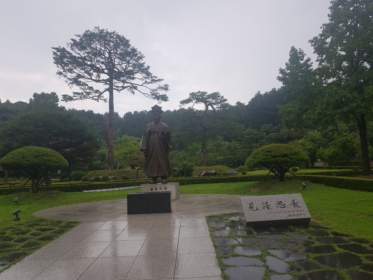 그 다음은 오죽헌에 갔다. 날씨가 오락가락하여 우산을 못 챙겨온 친구가 버스기사분께 우산을 빌려서 갔다. 오죽헌 매표소를 통과해서 배롱나무 길을 따라 들어가면 제일 먼저 만나는 것이 율곡이이 동상이다.