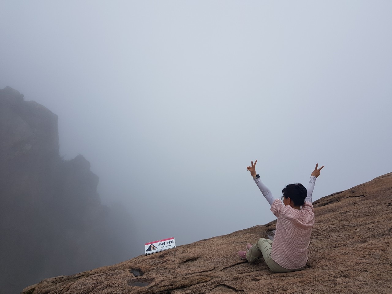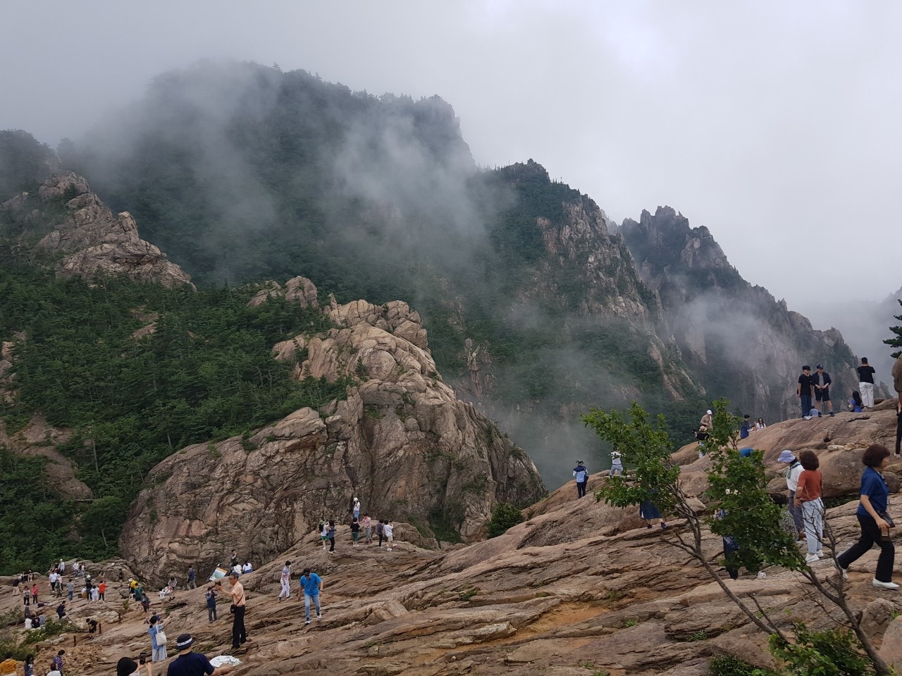 7.17.일요일 아침 일찍 일어나 강원도의 경치에 한번 다시 놀라고 근처에 있는 식당으로 이동하였다. 저녁을 술을 한잔 한지 어찌 아시고 황태해장국이 나왔다. 어제 황태국보다는 조금 아쉬웠지만 숙취해소에는 딱 좋았다. 든든하게 먹고 설악산 케이블카를 타러 갔다. 조금 일찍 도착하여 이곳저곳을 구경하다가 케이블카를 타러 갔다. 소나기가 내린 다음이라서 그런지 시야가 좋지 않았다. 케이블카를 타고 가서 권금성으로 갔다. 바위로 둘러쌓여서 경치가 정말 멋졌다. 시간만 있으면 여기서 그냥 반나절을 보냈으면 좋겠다고 했다. 운무로 덥힌 권금성은 내가 신선이 된 것 같았다.