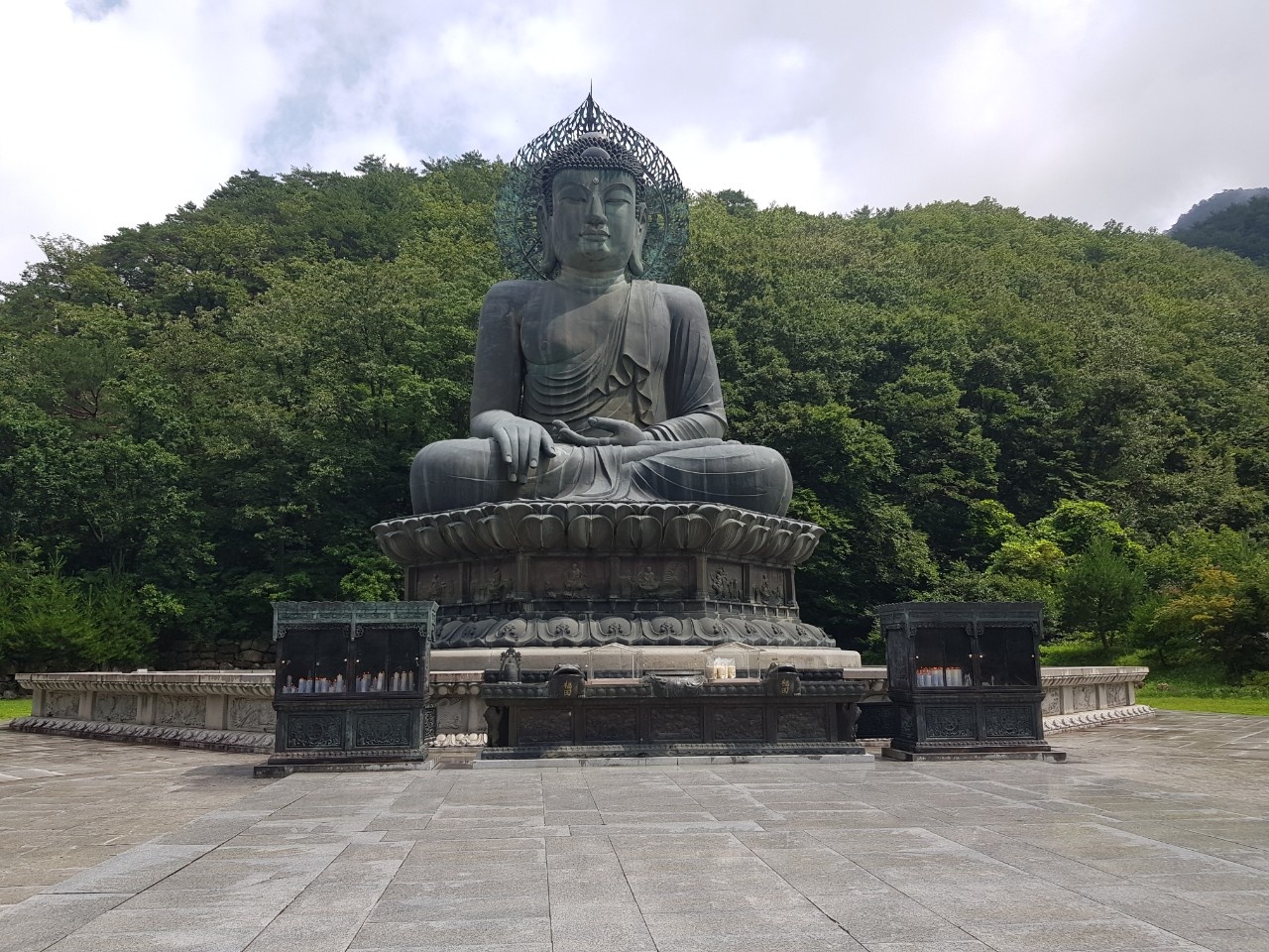 어느 정도 구경을 하고 있는데 갑자기 소나기가 내려서 아쉽지만 내려왔다. 날씨가 좋을떄는 울산바위도 보인다고 했는데.... 내려와서 신흥사로 갔다. 통일대불이 엄청 컸다.
