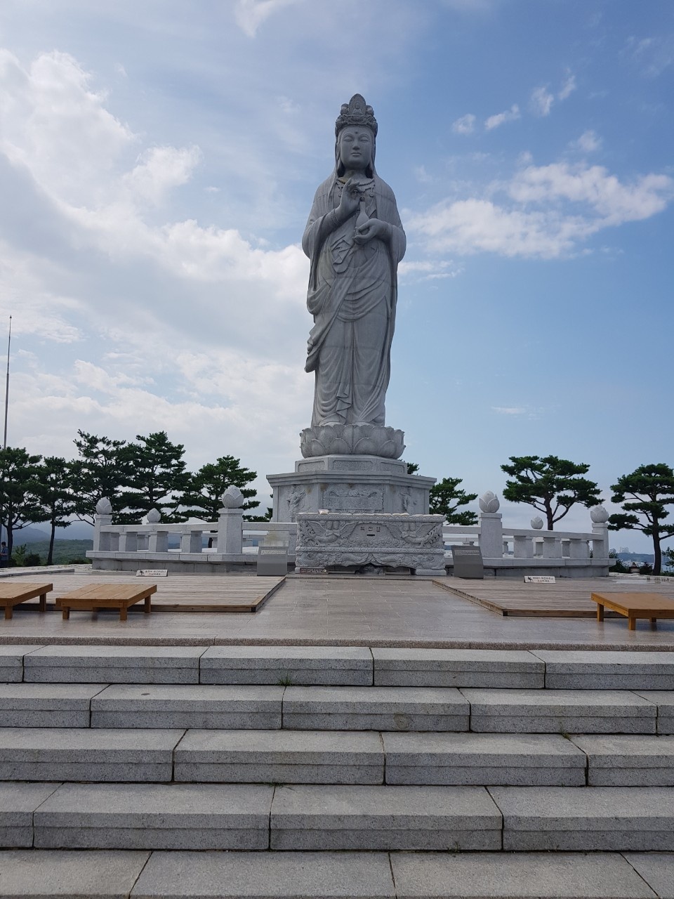 아쉬운 시장 구경을 뒤로 하고 마지막 여행지인 낙산사로 향하였다. 왜 낙산사가 우리나라 명승지로 꼽히는지 알 수 있었다. 멋진 자연경관과 소나무 숲, 해수관음상과 사찰건물이 어우러진 정말 멋진 곳이었다. 2005년에 낙산사에서 화재가 났을때 이 나무들이 전부 불타지 않은 것이 정말 다행이라는 생각이 들었다. 원통보전 가는 길 옆에 해수관음상으로 향하는 길이 있었는데 그 길이 참 예뻤다. 꿈이 이루어지는 길이라고 하여서 그 길을 걸으면서 꿈이 이루어졌으면 바래보았다. 꿈이 이루어지는 길을 지나 드디어 만난 해수관음상, 바다를 바라보며 서 있는 모습이 인상적이었다.