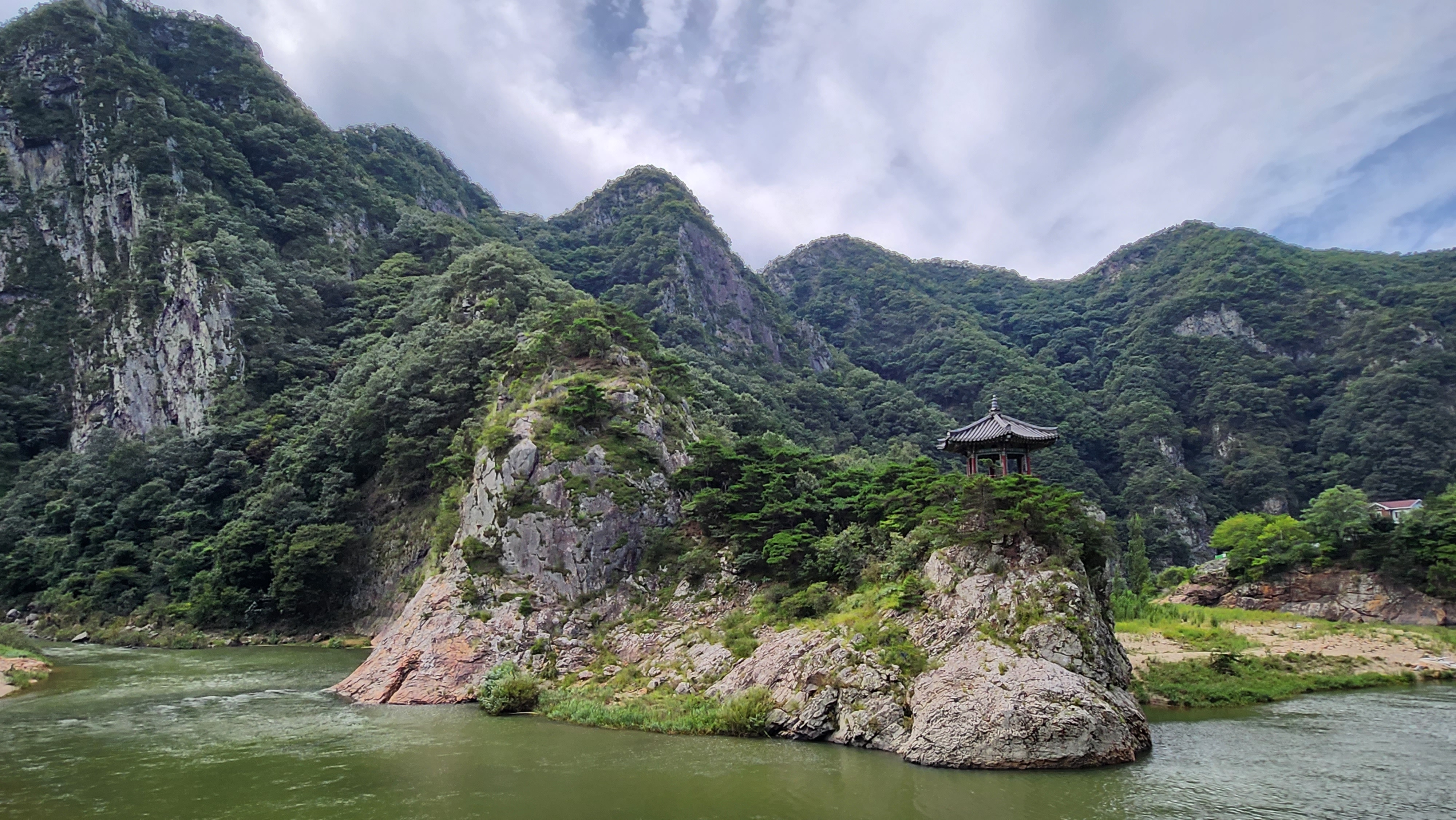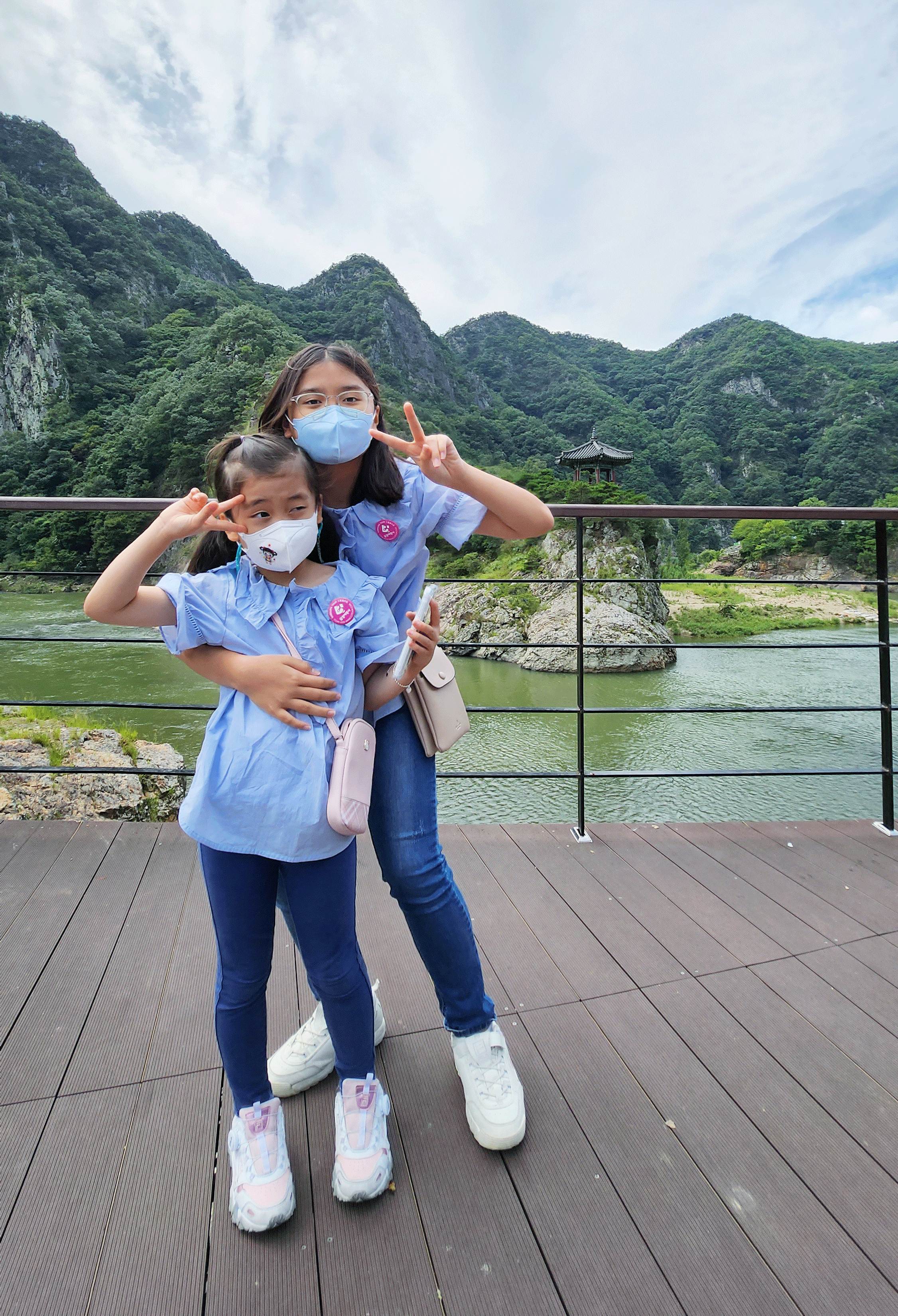 첫 번째 도착한 곳은 월류봉입니다. 8월 말이지만 더울 줄 알았는데 의외로 쌀쌀한 바람이 불어 깜짝 놀란 것도 잠시! 경치가 너무 멋있어서 아이들 사진도 찰칵찰칵 찍어주고 다른 가족들(?)도 찰칵찰칵 찍어드렸습니다.