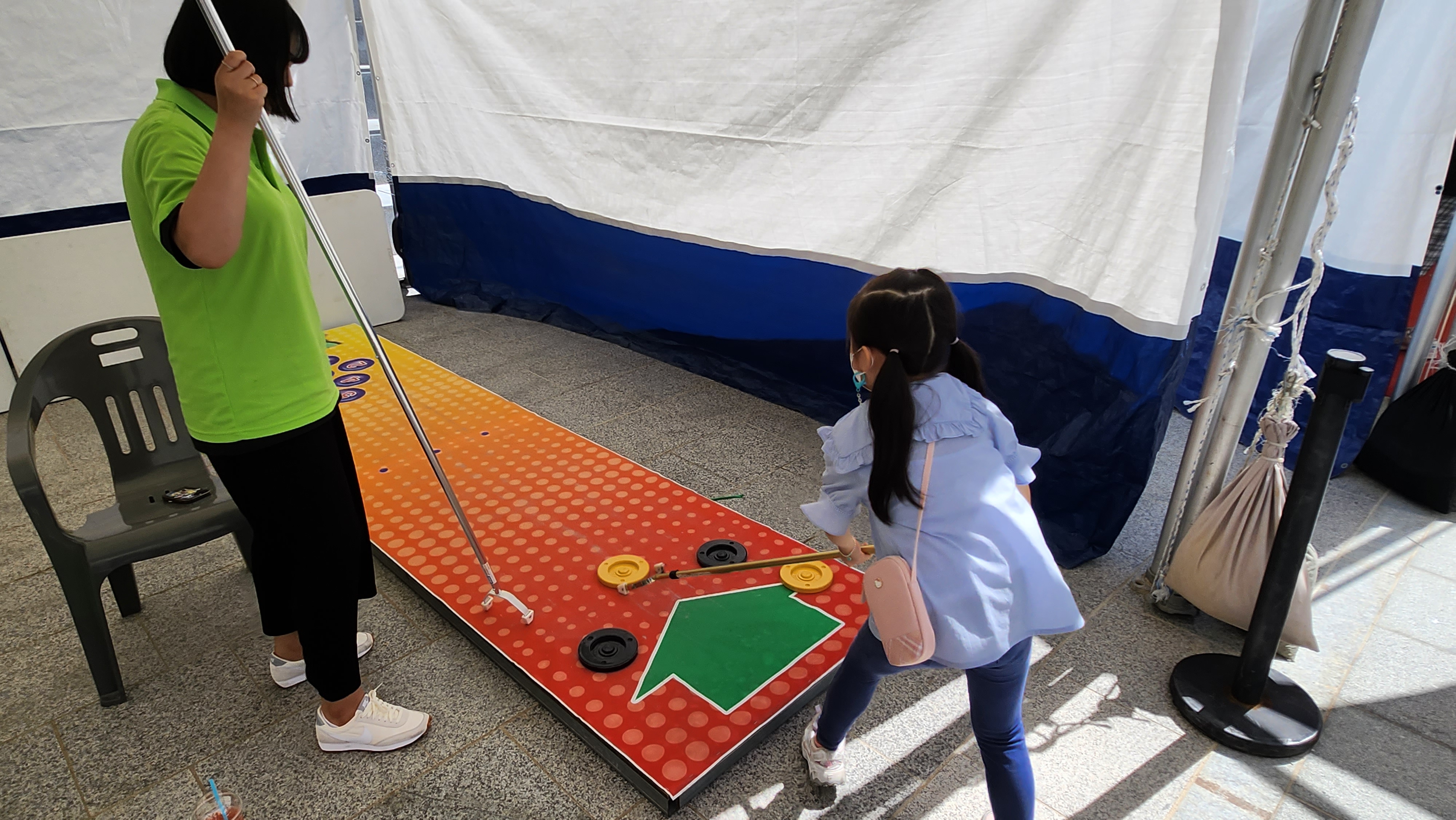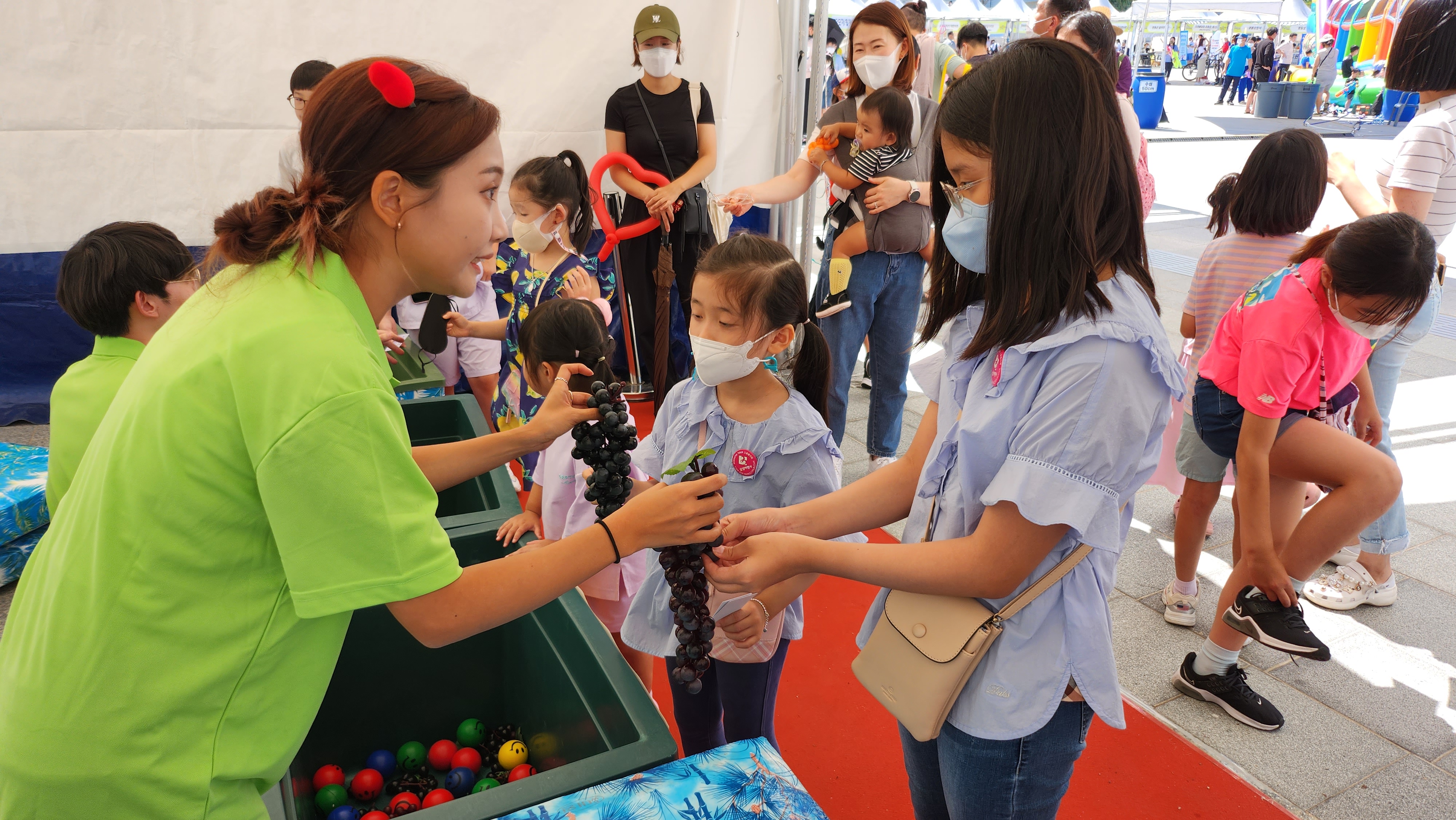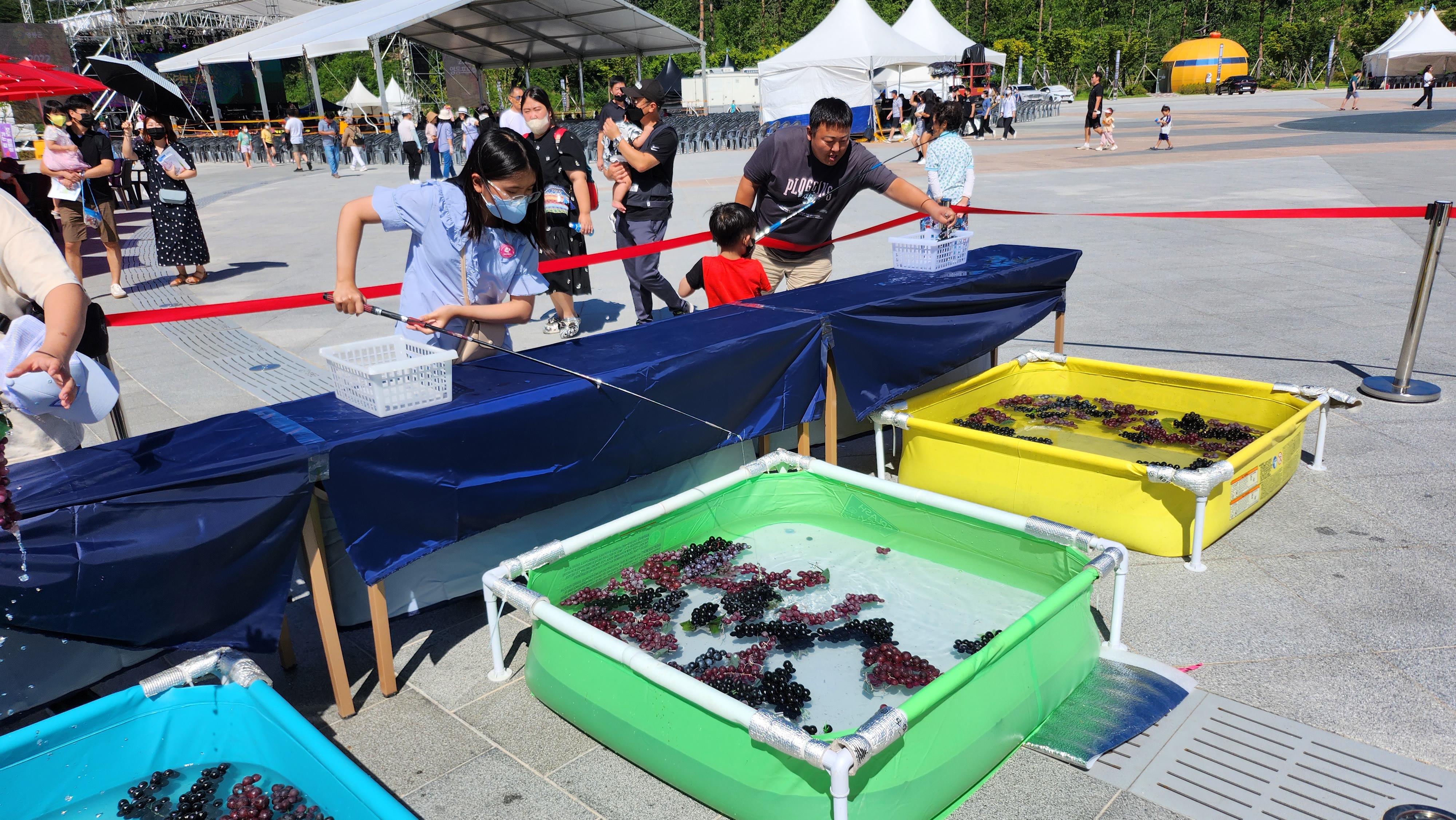 시식으로 먹어 본 것 중 작은데 달고 새콤한 사과가 너무 맛있어 한 통 사기로 했는데 진짜 이 루비에스 사과 진심 너무 맛있었습니다. 내년에 또 사 먹어야겠다 싶어 어디서 산 건지 꼼꼼히 기록 남기려고 직판장? 사진도 꼼꼼히 찍고! 이제 메인이벤트 축제장으로 이동! 축제장에는 볼거리도 즐길 거리도 많았는데 아이들이 좋아할 만한 게 정말 많았습니다. 포도 찾기도 하고 컬링, 골프, 포도낚시 등 하나당 천원이었는데 생각보다 알차서 좋았던 것 같습니다.
