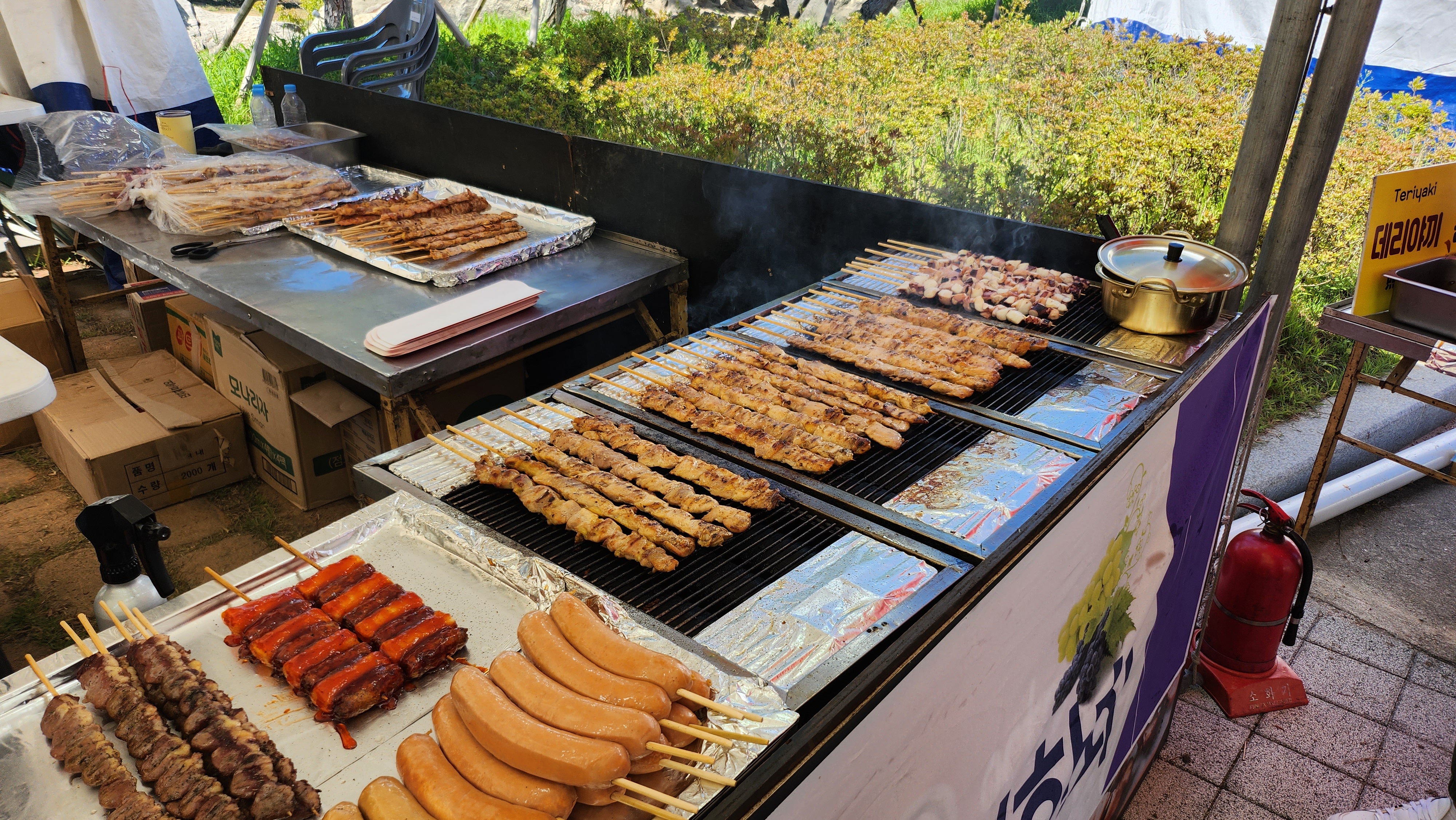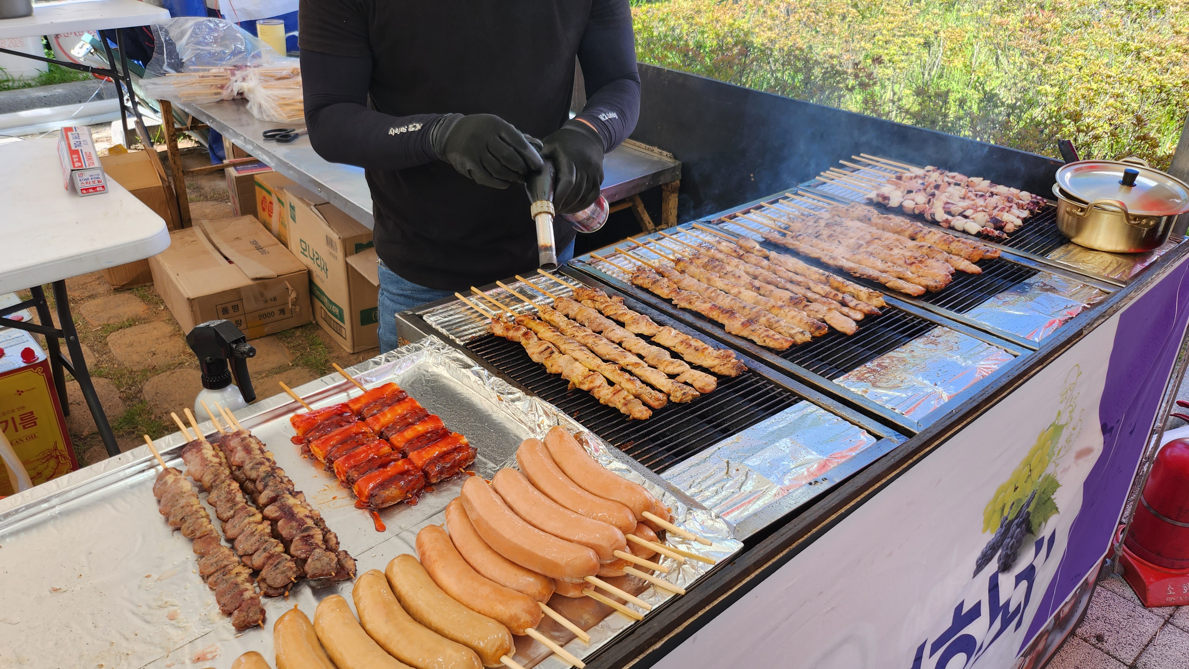 이쯤 놀고 나니 덥고 배기 고파 아이들이 꼬치 먹자고 성화입니다. 사실 체험장은 축제장 제일 위쪽에 있었고 우리는 수많은 먹거리를 지나쳐 왔던 터라 아이들이 뭘 먹을지 벌써 정했었나 봅니다 ㅎㅎ 먹을 것에 진심인 아이들! 줄이 긴데도 꼬지를 먹을 거라고 -_- 줄을 섭니다. 하... 그냥 다른 거 먹어도 될 텐데 말이죠. 하지만 막상 바로 앞에서 보니 줄 서기를 잘했다는 생각도 드네용.
