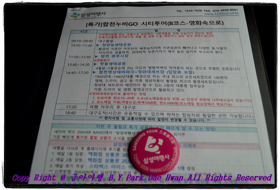 "여행은 모든 세대를 통틀어 가장 잘 알려진 예방약이자 치료제이며 회복제이다" 라는 명언이 있습니다. 여행 떠나기 좋은 이 시기에 저는 5월6일 합천 누비GO 시티투어 B코스 영화속으로 여행을 다녀왔습니다.