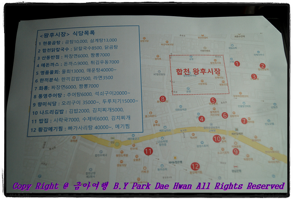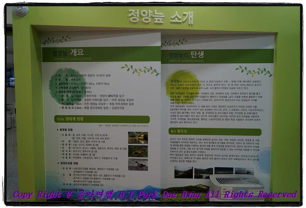 비가 많이 내리는 날 여행하면 더 기억에 남는 법인데 유난히 비가 많이 내린 5월6일에 합천 누비GO 시티투어 여행기를 올려보고자 합니다. 05월06일 아침 09시쯤에 탑승지인 "법원 건너 농협"에 도착하였습니다. 제가 탈 차량은 드림관광 7965호 였으며 가이드님으로는 삼성여행사 통해 여행다니면서 처음뵙는 가이드님이신 김영은 가이드님께서 수고해주셨으며 운전으로 수고해주시는 승무사원님께서는 김대기 승무사원님께서 수고해주셨습니다. 합천 누비GO 시티투어 이 날 코스는 B코스인 영화속으로 코스였으며 정양늪생태공원부터 시작하여 합천왕후시장 점심식사, 핫들생태공원, 합천영상테마파크 & 청와대세트장 코스였습니다. 버스는 09시10분에 법원 건너 농협을 출발하여 반월당역, 두류역 광장코아, 성서홈플러스까지 진입 후 가이드님 인사 및 일정소개 하셨습니다. 이후 일정표와 뺏지를 나누어 주셨으며 뺏지는 합천영상테마파크 입장시 하이패스 기능을 담당하게 됩니다^^ 일정표 뒤에 왕후시장 식당소개도 자세히 안내되어 있었습니다^^ 저는 여행을 할 때 제가 식사할 식당을 사전에 몇 군데 조사하고 가는지라 이러한 서비스까지 받을 줄 몰랐는데 왕후시장 근처 식당소개가 자세히 안내 되어 있어서 여행사 측의 세심한 배려를 느꼈습니다. 법원 건너 농협 출발한지 약 50분만인 10시에 논공휴게소에 도착하였으며 20분간 휴식한다는 안내를 받았습니다. 논공휴게소 휴식 후 버스는 달리고 달려서 첫 번째 여행지인 "정양늪 생태공원"에 도착하였습니다. 이 곳에서는 약 40분정도의 관람시간이 주어졌으며 정양늪 생태학습관부터 먼저 둘러보기로 합니다. "정양늪" 소개 입니다. 경남 창녕군에 가면 우포늪이 있지만 합천군에는 정양늪이라는 곳이 있습니다. 정양늪생태공원은 습지로써 물가에 사는 수생생물과 새들을 비롯하여 다양한 생물이 살아갈 수 있는 공간 입니다. 습지 면적은 약 41만평으로 생태학습관, 정양늪생명길, 관찰데크, 쉼터, 조류탐조대, 꽃터널, 어린이놀이터, 조형물 등이 있습니다.  정양늪 생태학습관 전망대에서 바라본 정양늪 입니다^^   나무데크길 따라 걸으면서 담아본 사진 입니다. 이 날 비가 많이 내리긴 하였지만 우산을 쓰고 나무데크길 걷는 묘미가 나름 운치있고 좋았습니다^^  정양늪 생태공원에서 약 45분정도 관람 후 버스를 타고 다음 목적지인 "합천 왕후시장" 으로 이동하였습니다. 왕후시장에서는 1시간40분이라는 엄청나게 여유있는 시간이 주어졌습니다. 왕후시장 장날은 3일과 8일에 열리는 5일장 입니다. 장날되면 시장의 활기찬 모습을 볼 수 있었겠지만 이 날은 장날이 아니었기에 조용하였습니다. 위에서도 제가 언급하였지만 저는 여행을 하면 사전에 미리 식당을 조사해놓고 가기에 미리 알아봐둔 칼국수집으로 이동하였습니다. 옛날 시골 할머니댁에서 먹던 시골칼국수 였는데 콩가루가 들어간 전통칼국수 였습니다. 비 오는 날 딱 어울리는 음식을 점심식사로 식사 맛있게 하였습니다^^ 1시간40분동안 여유있게 식사를 하고 후식까지 먹고 시장까지 둘러본 후 다음 목적지로 작약꽃이 피는 핫들생태공원으로 이동하였습니다^^ 핫들생태공원에서는 가이드님이 사전에 20분정도 관람하는 것이 어떻겠습니까? 하고 동의를 구하였으며 모두의 동의를 얻어 25분정도 관람하는 시간을 가졌습니다. 핫들생태공원은 황강주변에 있는데 봄, 여름에는 작약 맛집이고 가을에는 핑크뮬리 맛집입니다^^       핫들생태공원에서 찍어본 작약꽃 입니다. 작약꽃의 꽃말은 "수줍음" 입니다. 작약꽃은 꽃이 크다고 함박꽃으로도 불리며 육지에서 보는 연꽃같은 느낌이 들기도 합니다. 대구 근처 작약꽃으로 유명한 곳이 핫들생태공원도 있지만 경북 의성에 조문국사적지에도 작약꽃밭이 유명합니다. 핫들생태공원 작약꽃을 둘러보고 다시 버스 타러 가는 길에 징검다리 통해서 건너왔습니다^^ 이 날 비가 많이 내리기도 하고 물살이 세서 약간 스릴이 있었습니다 ㅎㅎ 핫들생태공원 작약꽃밭 구경 후 다음 목적지로 합천 영상테마파크 & 청와대 세트장으로 이동하였습니다..^^ 이 곳에서는 약 3시간정도 여유롭게 관람할 수 있는 시간이 주어졌습니다. 합천영상테마파크는 1920년대에서 1980년대를 배경으로 하는 시대물 오픈세트장 입니다. 각시탈, 에덴의 동쪽, 빛과 그림자, 인천상륙작전, 태극기휘날리며, 강철비 등 각종 영상작품이 촬영된 드라마 촬영세트장 입니다. 이번 합천 누비GO 시티투어 코스는 전반적으로 시간 여유가 많아서 좋았습니다.         합천 영상테마파크 구석구석 둘러보면서 찍어본 사진입니다. 국내에 드라마세트장이 순천에도 드라마세트장이 있고 충남 논산에 가면 선샤인랜드가 있고 전북 익산에 가면 교도소 세트장이 있습니다^^ 합천영상테마파크를 관람하고 청와대세트장으로 이동할 때에 찍어본 사진입니다. 어린이놀이터였으며 놀이터가 잘 조성되어 있어 어린아이들이 놀기 좋겠다는 생각이 들었습니다^^ 분재공원 입니다^^ 청와대 세트장 입니다^^ 저도 작년에 개인적으로 청와대 직접 다녀와보고 이 곳을 방문하였는데 실제 청와대와 비슷해서