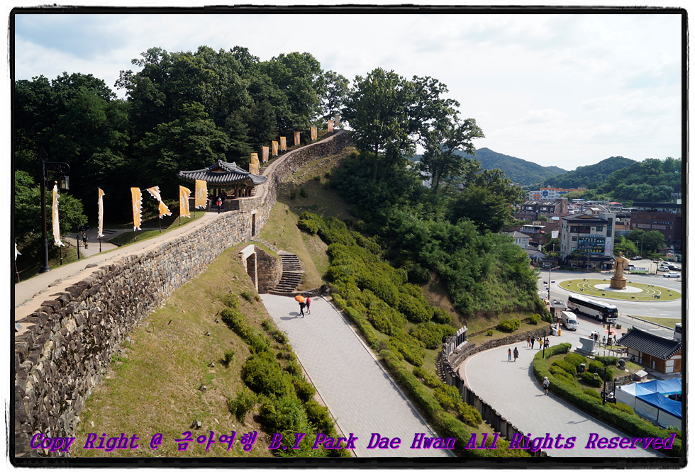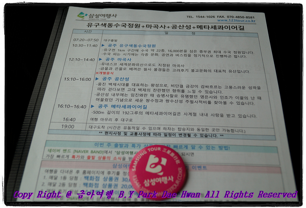 공산성에서 삼성여행사 트레이드 마크인 분홍색 뺏지가 하이패스 역할을 잘 수행해주었습니다..^^  공산성 둘러보면서 찍어본 사진들 입니다..^^   공산성에서 바라본 경치 입니다. 백제 큰다리, 공주대교, 금강, 미르섬, 공주시내가 한 눈에 들어와 기분이 좋았습니다..^^ 이런 멋진 경치를 보는 맛이 또 여행의 묘미가 아닐까? 생각합니다 ㅎㅎ  "공산성 왕궁관련유적" 입니다. 전라북도 익산에 가면 왕궁리 유적이 있습니다..^^ 공산성 구경 이후 버스를 타고 마지막 여행지인 공주 메타세콰이어길로 이동하였습니다.    공주 메타세콰이어길 걸으면서 찍어본 사진들 입니다..^^ 메타세콰이어길은 정안천생태공원에 있으며 약 500m 정도 됩니다. 메타세콰이어길 주변으로 산책로가 잘 조성되어 있었으며 그네 의자, 벤치 등이 있었습니다. 뜨거운 태양, 햇살을 피해 산책하기 좋은 길이어서 계절에 상관없이 언제든지 산책해도 좋겠다는 생각이 들었습니다. 자연이 주는 힐링을 고스란히 느끼며 산책을 즐겼습니다. 저는 개인적으로 담양 메타세콰이어길보다 공주 메타세콰이어길이 훨씬 더 좋았습니다. 메타세콰이어길 근처에 연꽃이 피어나려고 하길래 사진으로 담아보았습니다..^^ 메타세콰이어길까지 산책 후 버스는 이제 대구로 이동하였습니다. 메타세콰이어길 출발한지 약 1시간13분만에 추풍령휴게소에서 약 15분간 휴식을 하였습니다. 휴식 후 버스는 달리고 달려서 출발 2시간40분만에 대구에 도착하였습니다. 이 날 가이드님으로 수고해주신 이현의 가이드님과 안전운행으로 수고해주신 드림관광 조성철 승무사원님께 이 자리 빌어서 감사의 인사를 올려드리며 여행후기를 마치도록 하겠습니다. 긴 글, 많은 사진 봐주셔서 대단히 감사합니다..^^