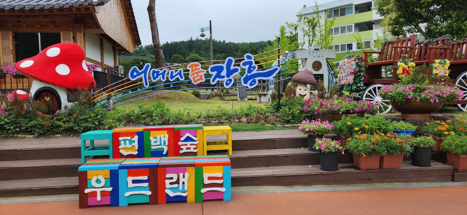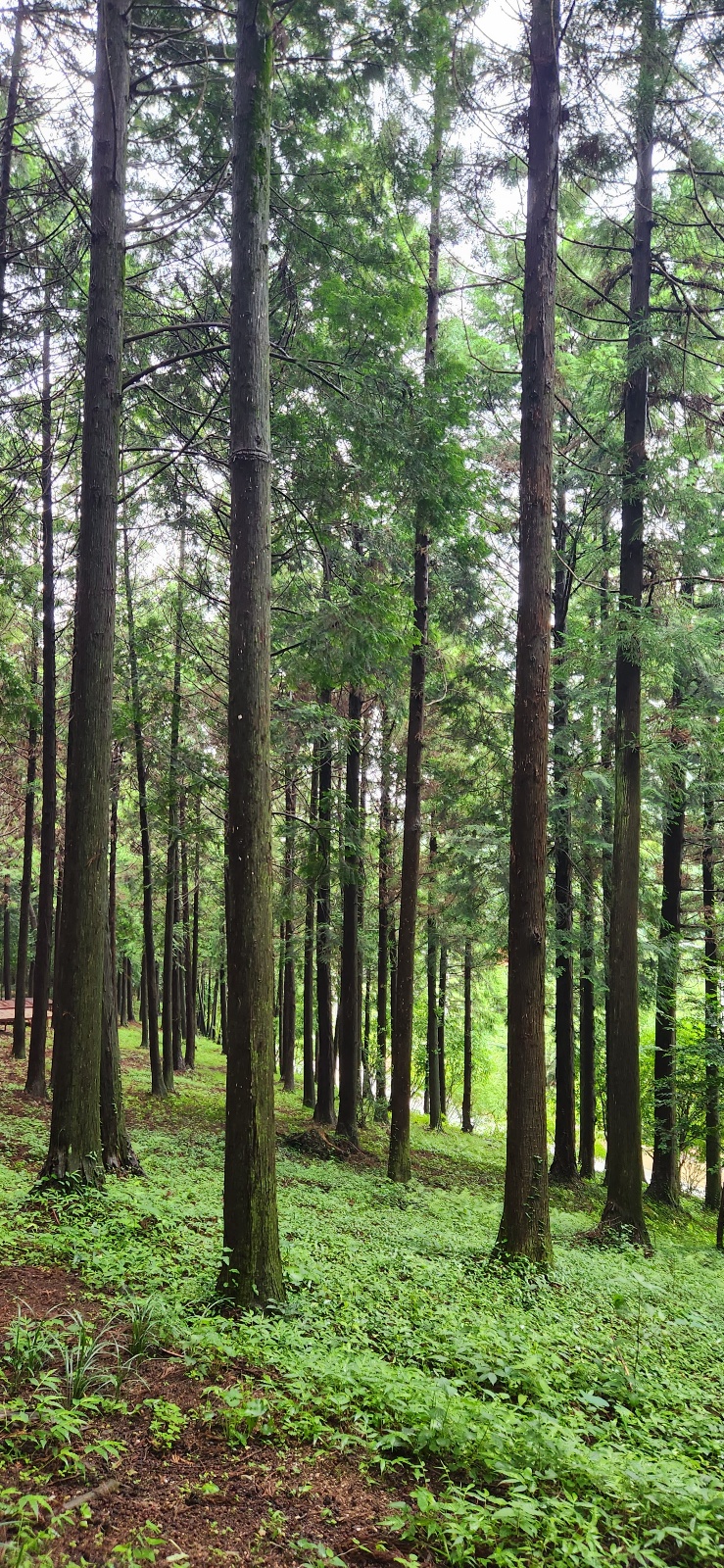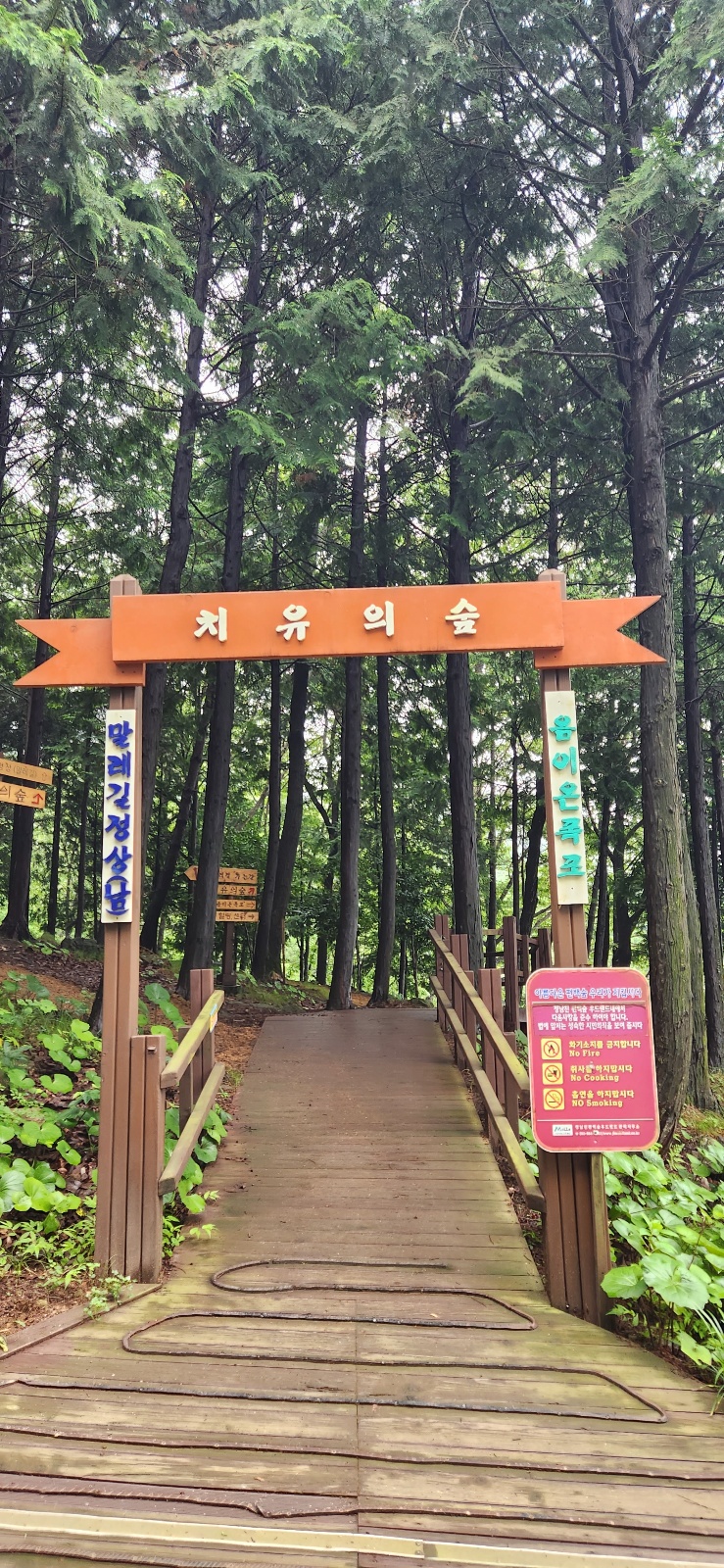 차에 타기 전에 간식으로 복숭아를 사서 먹었는데 그 다음날 대구로 오는 길에 휴게소에서 먹었는데 너무 싸고 맛있었다. 덤까지 얻었으니 말이다. 다음코스로 편백숲 우드랜드로 갔다. 입구에 들어서니 익숙한 편백향기가 마음까지 상쾌하게 했다. 쭉쭉 뻗은 편백나무가 멋있기까지....