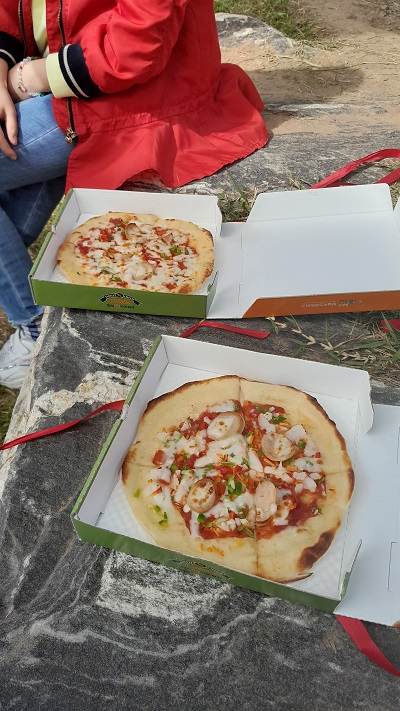 갓 구운 피자를 먹을 곳을 찾다가 근처 의자에 앉아서 먹었다. 하지만 피자는 모두 맛있었다. 열심히 만들었는지라 더 그렇게 느껴졌던 것 같다.