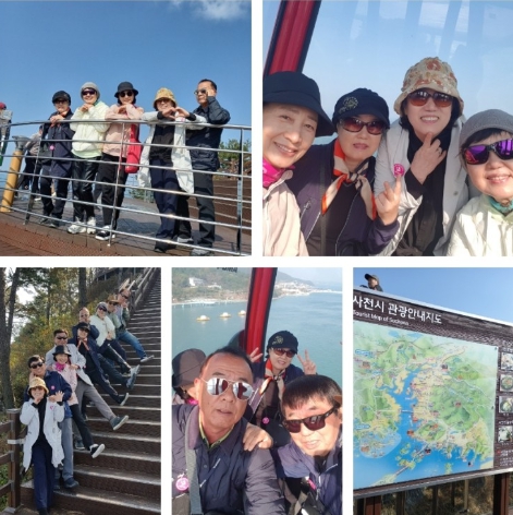 아침일찍 서들렀건만 성서홈플까지 태워준다던남편차가 방전되는바람에 부랴부랴 택시를타고 마음졸여가면서홈플도착 아직여행차가 오지않아서 안도의 숨을쉴수가있었다 경남남해사천케이블카도착 대방정류장을출발 초양정류장 각산정류장을가는길 바다를가로질러멋진풍광에 기분이 설레였다 케이블카총길이가 꽤긴것같았다 전밍대에서내려다보는 남해바다 크고작은섬들이 한눈에들어왔다 계단을오르다가 친구들과한컷한컷 추억의사진들을 찍었다 나중에 친구들의모습을보는재미도 솔솔할것같았다 용궁시장에들러 회거리장만하고 식당으로갔다 푸짐한갖가지 회로입맛을돋우고 서로의우정을쌓고 얼큰한매운탕으로 맛나게식사를하고 노산공원에도가보았다 다음코스 남일대해수욕장 으로 향했다 부드러운 모래 아름다운해안선따라 탁트인바다 저넘어코끼리를닮은바위가있어 그곳을보면서 사진도찍기도했죠 남해에있는친구 한명과 합류를해서 더즐거움이컸었다 이친구는케이블카타고 우리하고 지내다가 계속 드림관광차따라 와서 저희들과 함께했었죠 오늘은여기서 친구랑인사를건네고 우리일행은 대구로내려 가야했다 그친구는하루전수산시장에들러 죽방멸치를 친구들께 준다고 예쁘게포장을해두었다가 오늘한박스씩 선물을받았다 다시한번 그 고마움 을 느꼈다 대구로 돌아오는길 선진리성에 잠깐들렀다가 차에 올 랐다 돌아오는차안에서 가이드님 가위바위보게임 끝마무리를 아주즐겁게진행했다 알차게여행을보낼수있어 삼성여행사에 감사드리며 안전운전해주신기사아저씨 알뜰살뜰살피시는 가이드님모두감사드리며 더 좋은상품으로 다음을 기대해봅니다 |