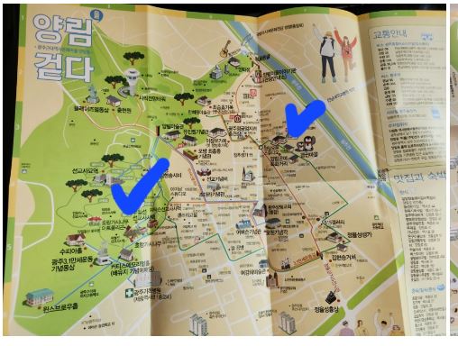 마을의 지도에서 보면 오른쪽에 파란색으로 체크되어있는 곳은 펭귄마을이고 왼쪽에 파란색으로 체크되어있는 곳은 펭귄마을에서 15분 거이릐 우일선선교사사택인데 대구로 치면 청라언덕 같은 곳으로 110년의 역사가 있는 곳이에요. 시간이 되면 그곳도 방문해봐야겠어요