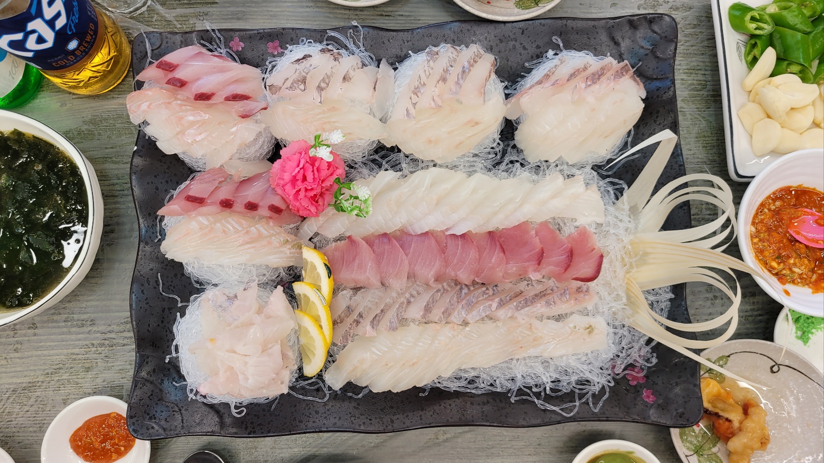 경포해변을 바라보며 모듬회정식을 먹으며 정겨운 얘기꽃을 피웁니다