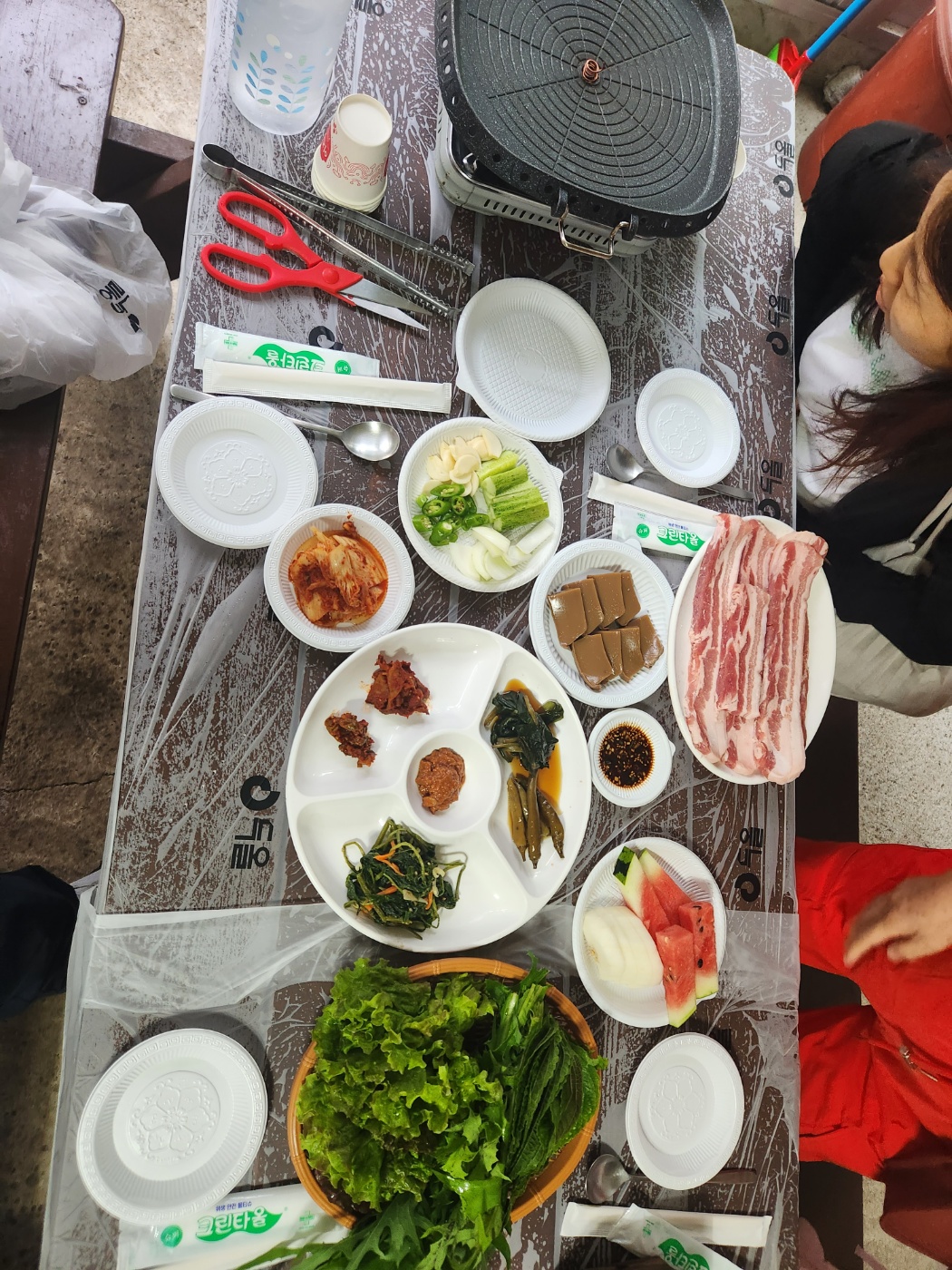멋진 바다를 뒤로 하고 곰배령 숙소로 향하였습니다. 저녁은 식도락 여행이 자랑하는 식사  바베큐 삼겹살입니다.