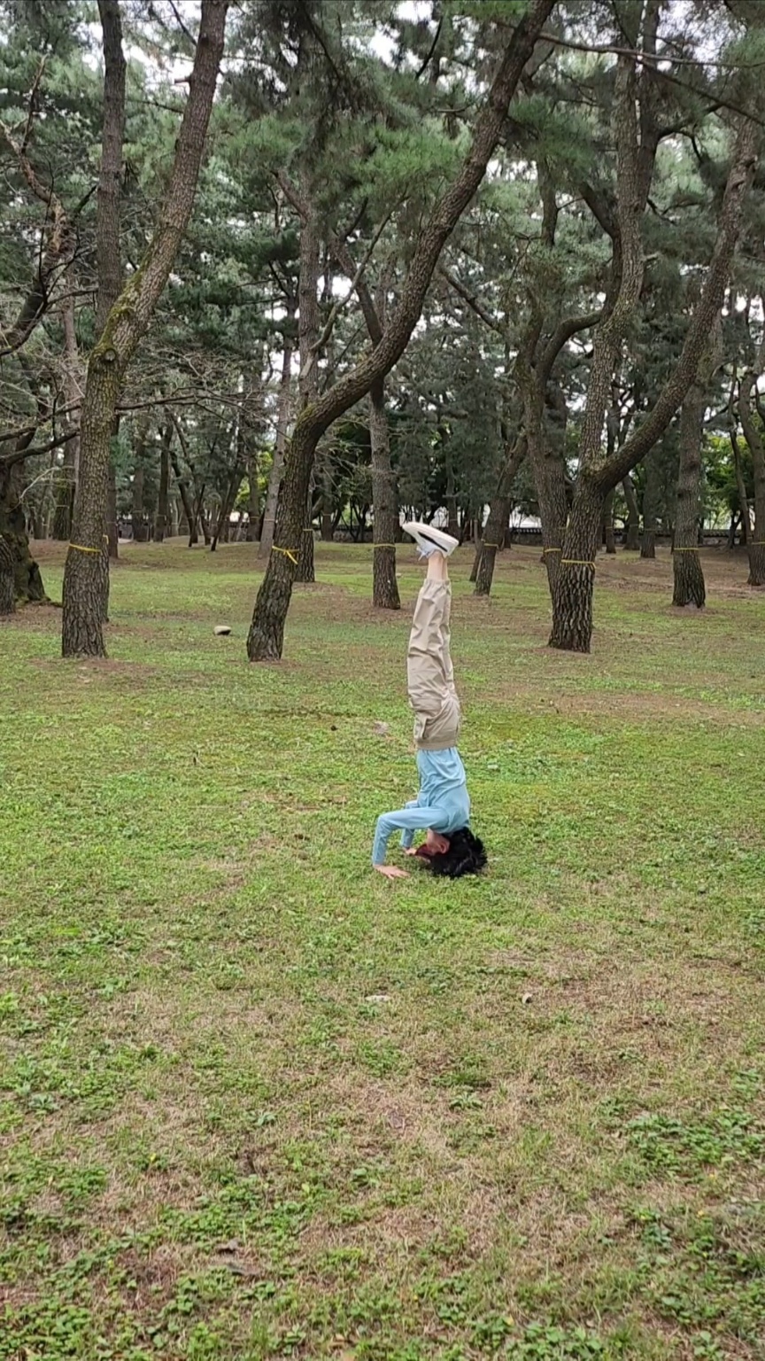 저는 짱구 어린이처럼 거꾸로 서기를 했습니다. 나무는 똑바로 세워져 있고~ 저는 거꾸로 서기를 하고~!