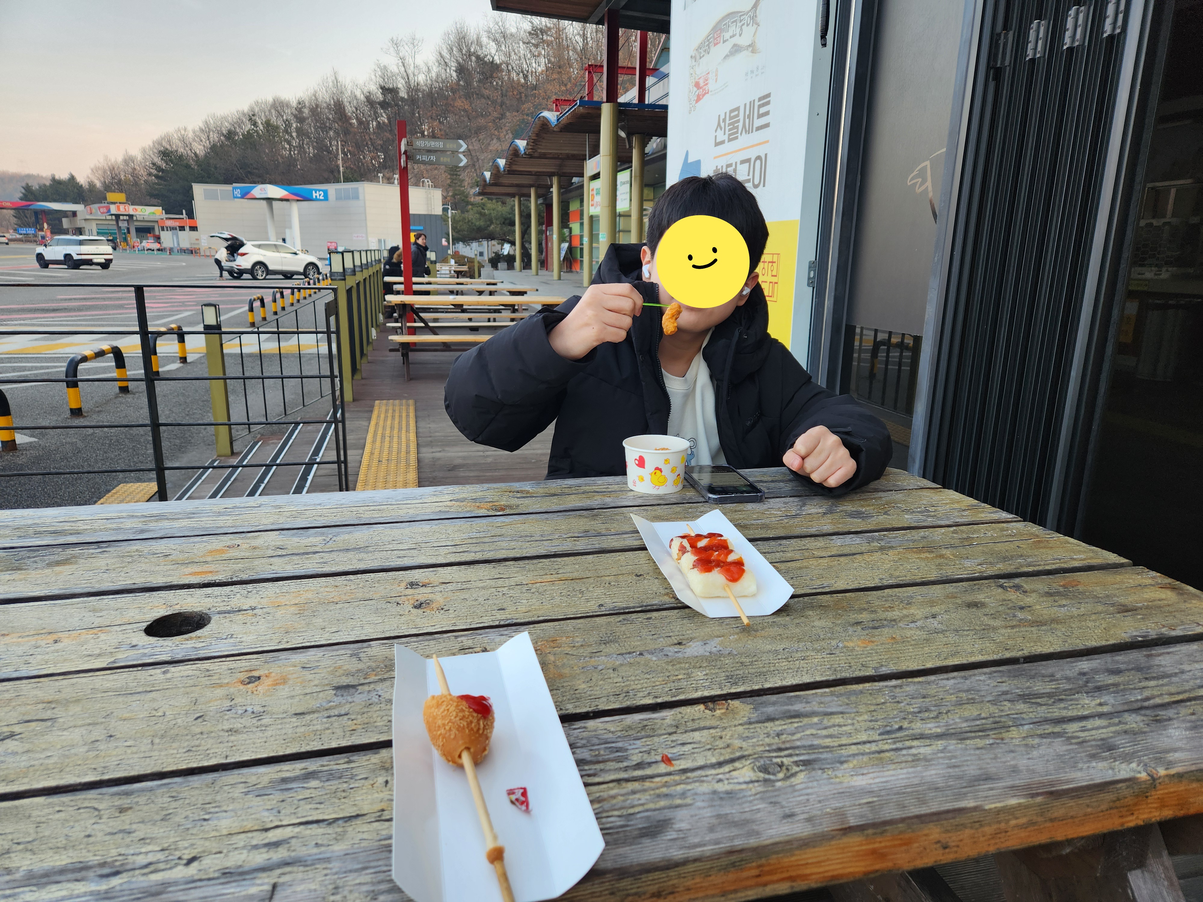 아침 6시 20분 범어역에서 우리를 기다리던 버스를 타고 강원도로 출발했다. 어두운 새벽길을 헤치고 버스를 타시는 여행객들을 보자 왠지모를 반가움이 들었다. 잠시 눈을 붙인 사이 버스가 안동휴게소에 도착했다. 아이는 휴게소에서 소떡소떡과 핫도그를 사먹었는데 정말 맛있다고 했다.